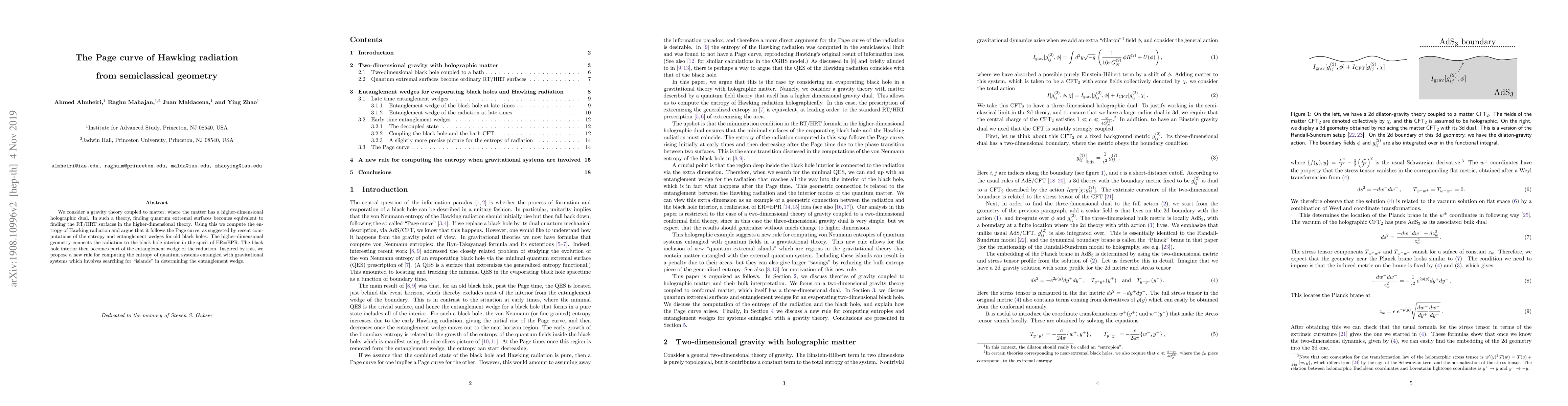 We consider a gravity theory coupled to matter, where the matter has a higher-dimensional holographic dual. In such a theory, finding quantum extremal surfaces becomes equivalent to finding the RT/HRT surfaces in the higher-dimensional theory. Using this we compute the entropy of Hawking radiation and argue that it follows the Page curve, as suggested by recent computations of the entropy and entanglement wedges for old black holes. The higher-dimensional geometry connects the radiation to the black hole interior in the spirit of ER=EPR. The black hole interior then becomes part of the entanglement wedge of the radiation. Inspired by this, we propose a new rule for computing the entropy of quantum systems entangled with gravitational systems which involves searching for "islands" in determining the entanglement wedge.