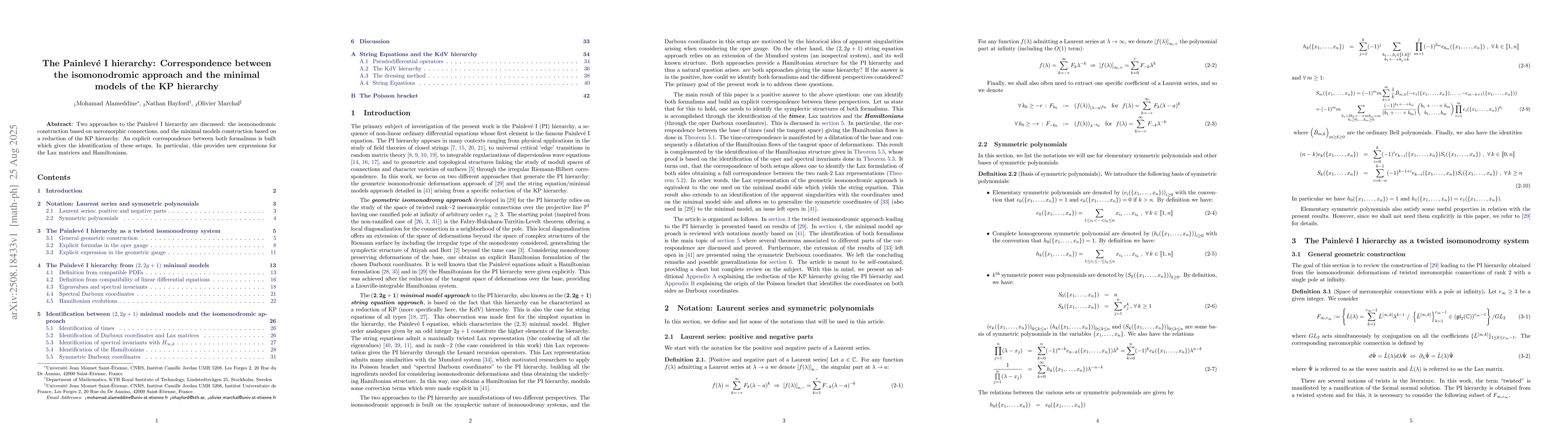 Two approaches to the Painlev\'{e} I hierarchy are discussed: the isomonodromic construction based on meromorphic connections, and the minimal models construction based on a reduction of the KP hierarchy. An explicit correspondence between both formalisms is built which gives the identification of these setups. In particular, this provides new expressions for the Lax matrices and Hamiltonians.