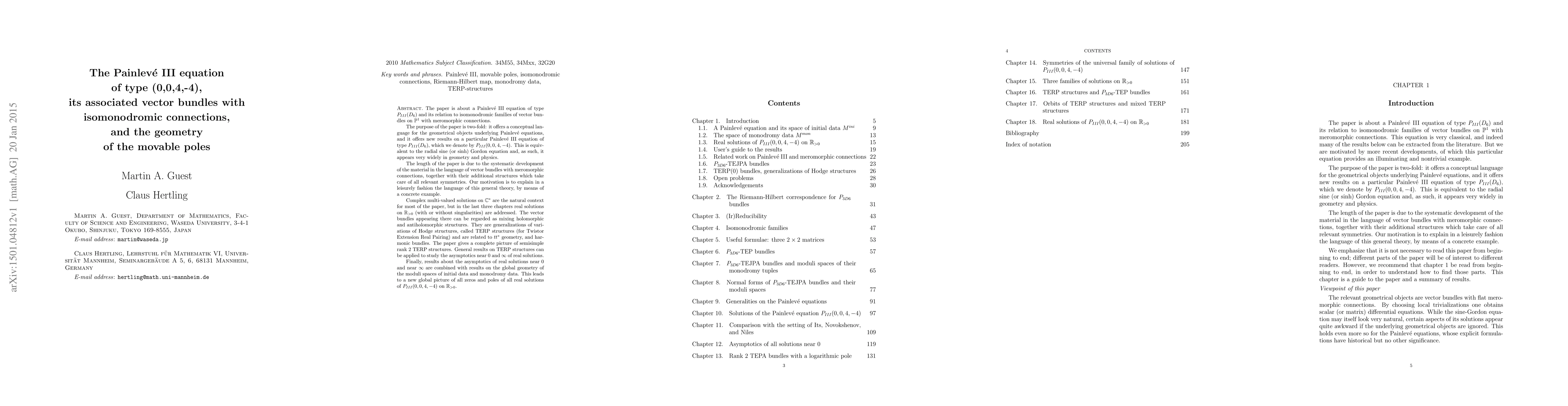 The paper is about a Painlev\'e III equation and its relation to isomonodromic families of vector bundles on P^1 with meromorphic connections. The purpose of the paper is two-fold: it offers a conceptual language for the geometrical objects underlying Painlev\'e equations, and it offers new results on a particular Painlev\'e III equation, which we denote by P_{III}(0,0,4,-4). This is equivalent to the radial sine (or sinh) Gordon equation and, as such, it appears very widely in geometry and physics. Complex multi-valued solutions on C^* are the natural context for most of the paper, but in the last three chapters real solutions on the positive real line (with or without singularities) are addressed. Results about the asymptotics of real solutions near 0 and near infinity are combined with results on the global geometry of the moduli spaces of initial data and monodromy data. This leads to a new global picture of all zeros and poles of all real solutions on the positive real line.