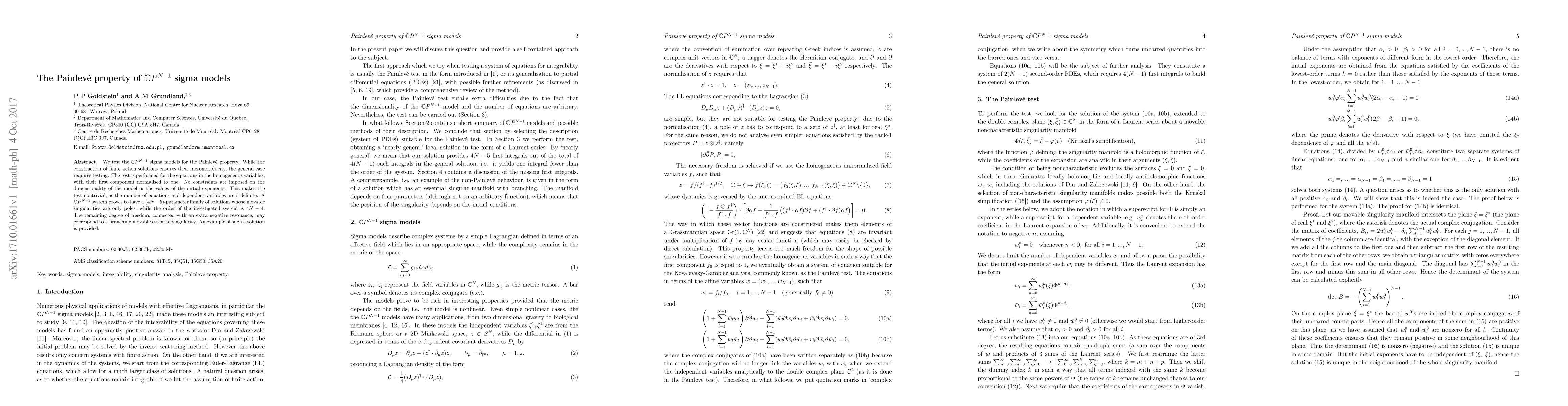 The research examines $\mathbb{C}P^{N-1}$ sigma models for the Painlevé property, finding that they possess a $(4N-5)$-parameter family of solutions with only pole singularities, suggesting potential essential singularities not fully constrained by the model. This investigation does not restrict model dimensionality or initial conditions, highlighting the nontrivial nature of the analysis.