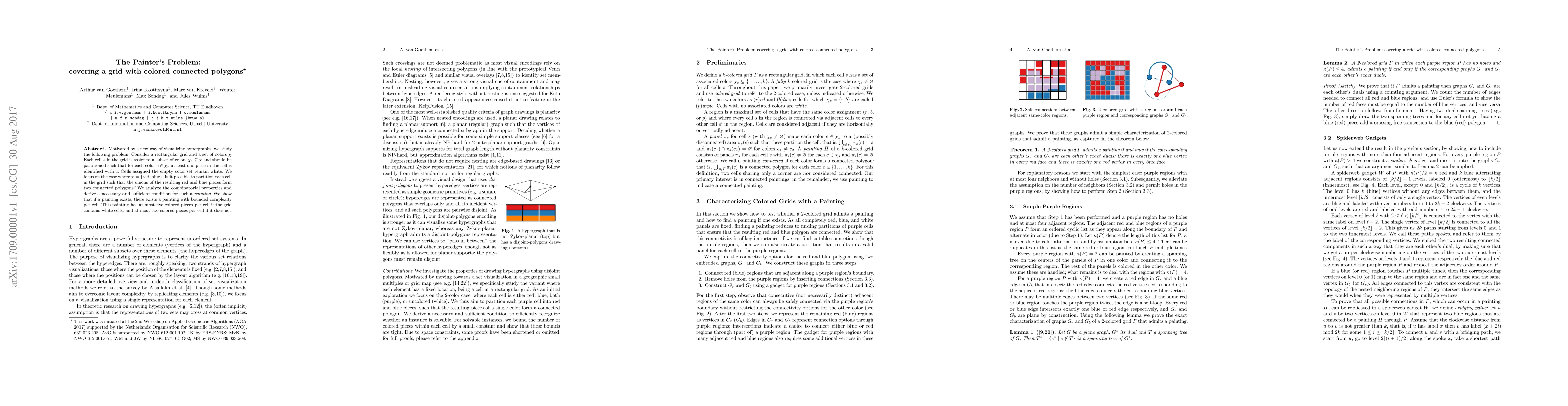 Motivated by a new way of visualizing hypergraphs, we study the following problem. Consider a rectangular grid and a set of colors $\chi$. Each cell $s$ in the grid is assigned a subset of colors $\chi_s \subseteq \chi$ and should be partitioned such that for each color $c\in \chi_s$ at least one piece in the cell is identified with $c$. Cells assigned the empty color set remain white. We focus on the case where $\chi = \{\text{red},\text{blue}\}$. Is it possible to partition each cell in the grid such that the unions of the resulting red and blue pieces form two connected polygons? We analyze the combinatorial properties and derive a necessary and sufficient condition for such a painting. We show that if a painting exists, there exists a painting with bounded complexity per cell. This painting has at most five colored pieces per cell if the grid contains white cells, and at most two colored pieces per cell if it does not.