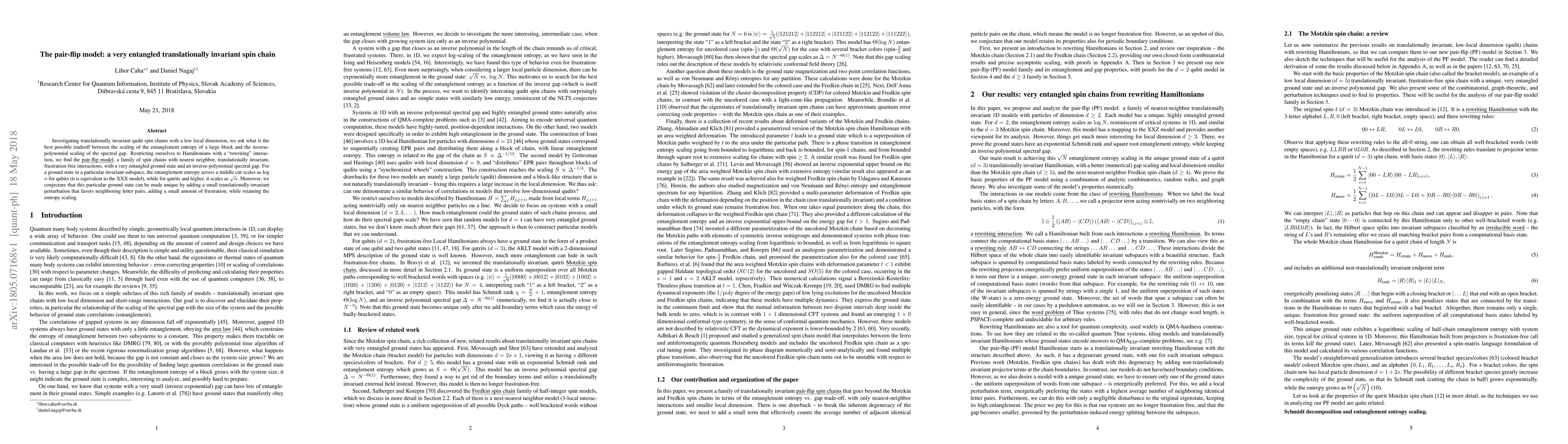 The pair-flip model is identified as a translationally invariant spin chain with a very entangled ground state and an inverse-polynomial spectral gap, achieving optimal entanglement entropy scaling for different dimensions. The model's entanglement entropy scales as $\log n$ for qubits and $\sqrt{n}$ for higher dimensions, and a small perturbation can make its ground state unique while preserving the entropy scaling.
