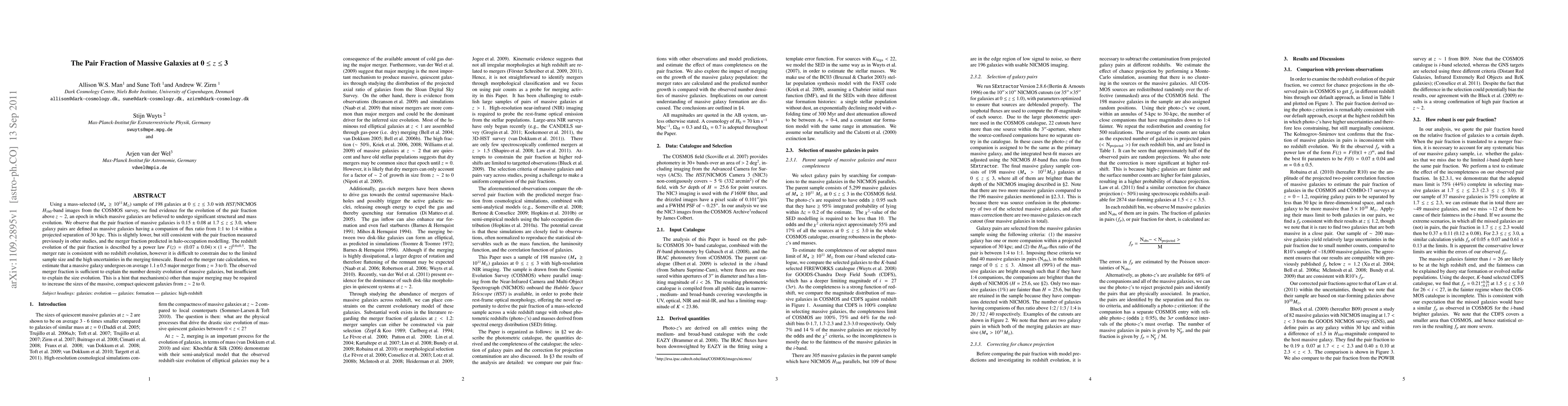 This study examines the pair fraction of massive galaxies (stellar mass ≥ 10^11 M☉) in the redshift range 0 < z < 3, finding a pair fraction of 0.15 ± 0.08 at 1.7 < z < 3.0, indicating a slight decrease in pair fraction with increasing redshift. The observed merger rate shows no significant redshift evolution, suggesting other mechanisms may be needed to explain the size evolution of these galaxies.