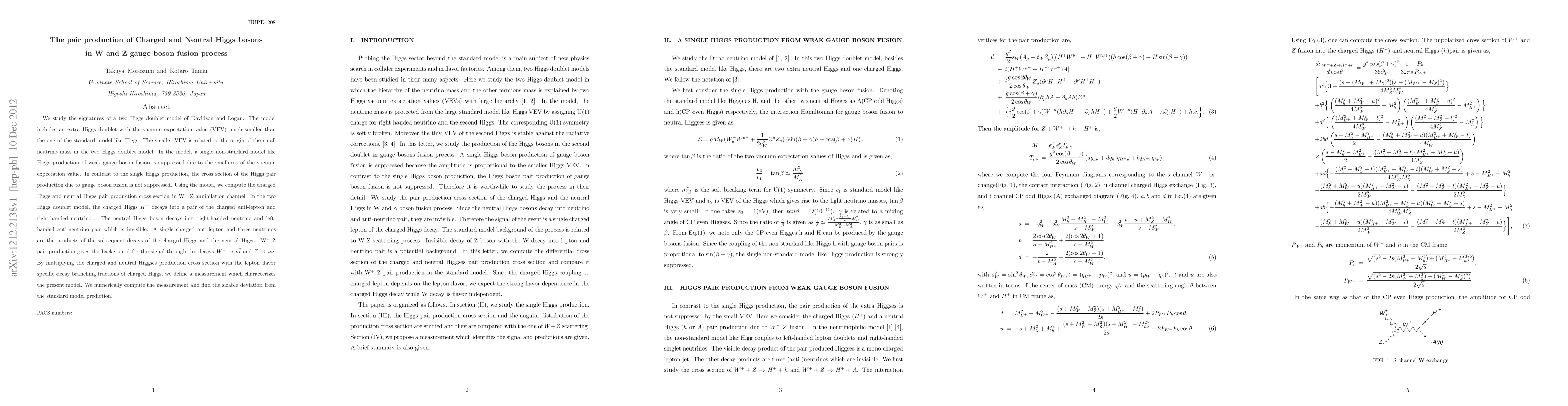 We study the signatures of a two Higgs doublet model of Davidson and Logan. The model includes an extra Higgs doublet with the vacuum expectation value (VEV) much smaller than the one of the standard model like Higgs. The smaller VEV is related to the origin of the small neutrino mass in the two Higgs doublet model. In the model, a single non-standard model like Higgs production of weak gauge boson fusion is suppressed due to the smallness of the vacuum expectation value. In contrast to the single Higgs production, the cross section of the Higgs pair production due to gauge boson fusion is not suppressed. Using the model, we compute the charged Higgs and neutral Higgs pair production cross section in W Z annihilation channel. In the two Higgs doublet model, the charged Higgs H^+ decays into a pair of the charged anti-lepton and right-handed neutrino. The neutral Higgs boson decays into right-handed neutrino and left-handed anti-neutrino pair which is invisible. A single charged anti-lepton and three neutrinos are the products of the subsequent decays of the charged Higgs and the neutral Higgs. W Z pair production gives the background for the signal through the decays W^+ ->nu l^+ and Z -> nu nubar. By multiplying the charged and neutral Higgses production cross section with the lepton flavor specific decay branching fractions of charged Higgs, we define a measurement which characterizes the present model. We numerically compute the measurement and find the sizable deviation from the standard model prediction.