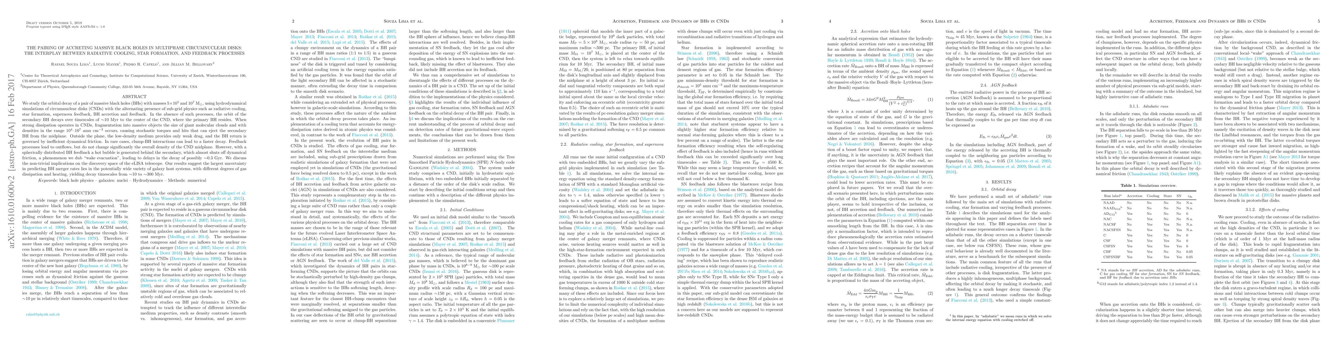 We study the orbital decay of a pair of massive black holes (BHs) with masses 5 * 10^5 and 10^7 M_sun, using hydrodynamical simulations of circumnuclear disks (CNDs) with the alternating presence of sub-grid physics such as radiative cooling, star formation, supernova feedback, BH accretion and feedback. In the absence of such processes, the orbit of the secondary BH decays over timescales of ~10 Myr to the center of the CND, where the primary BH resides. When strong dissipation operates in CNDs, fragmentation into massive objects the size of giant molecular clouds and with densities in the range 10^4 - 10^7 amu / cm^3 occurs, causing stochastic torques and hits that can eject the secondary BH from the midplane. Outside the plane, the low-density medium provides only weak drag, and the BH return is governed by inefficient dynamical friction. In rare cases, clump-BH interactions can lead to a faster decay. Feedback processes lead to outflows, but do not change significantly the overall density of the CND midplane. However, with a spherically distributed BH feedback a hot bubble is generated behind the secondary, which almost shuts off dynamical friction, a phenomenon we dub "wake evacuation", leading to delays in the decay of possibly ~0.3 Gyr. We discuss the non-trivial implications on the discovery space of the eLISA telescope. Our results suggest the largest uncertainty in predicting BH merger rates lies in the potentially wide variety of galaxy host systems, with different degrees of gas dissipation and heating, yielding decay timescales from ~10 to ~300 Myr.