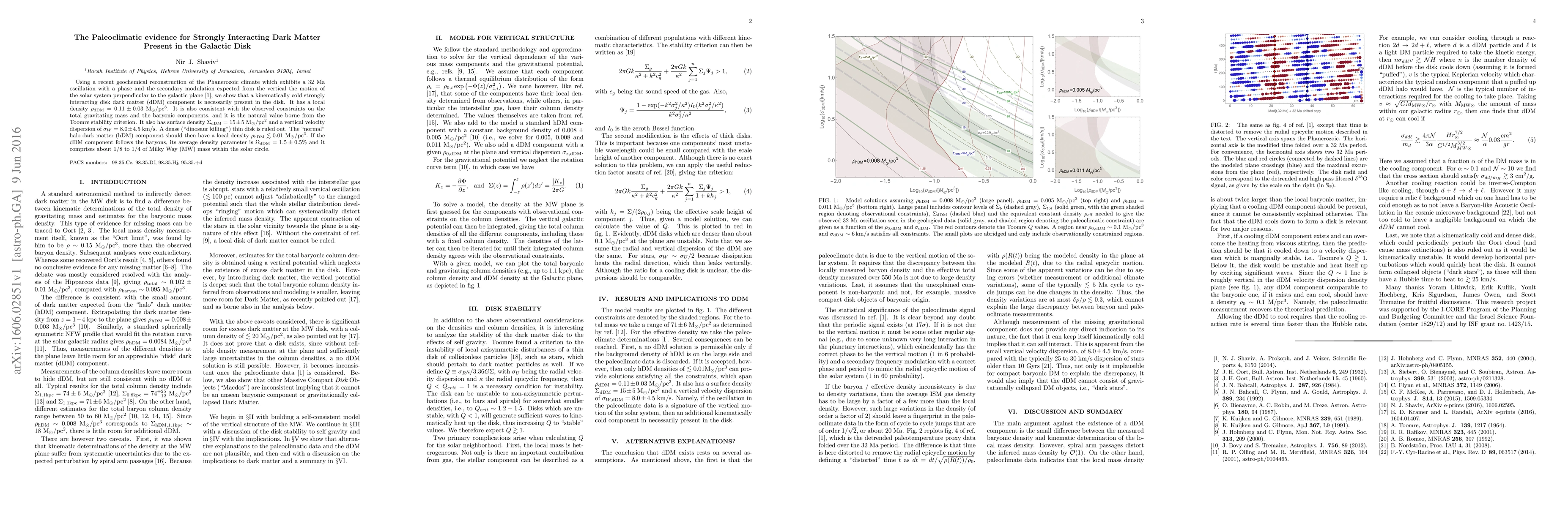 Using a recent geochemical reconstruction of the Phanerozoic climate which exhibits a 32 Ma oscillation with a phase and the secondary modulation expected from the vertical the motion of the solar system perpendicular to the galactic plane (shaviv et al. 2014), we show that a kinematically cold strongly interacting disk dark matter (dDM) component is necessarily present in the disk. It has a local density $\rho_\mathrm{dDM} = 0.11 \pm 0.03$ M$_{\odot}/$pc$^3$. It is also consistent with the observed constraints on the total gravitating mass and the baryonic components, and it is the natural value borne from the Toomre stability criterion. It also has surface density $\Sigma_\mathrm{dDM} = 15 \pm 5$ M$_{\odot}/$pc$^2$ and a vertical velocity dispersion of $\sigma_{W} = 8.0 \pm 4.5$ km/s. A dense ("dinosaur killing") thin disk is ruled out. The "normal" halo dark matter (hDM) component should then have a local density $\rho_\mathrm{hDM} \lesssim 0.01$ M$_{\odot}/$pc$^3$. If the dDM component follows the baryons, its average density parameter is $\Omega_\mathrm{dDM} = 1.5 \pm 0.5\%$ and it comprises about 1/8 to 1/4 of Milky Way (MW) mass within the solar circle.