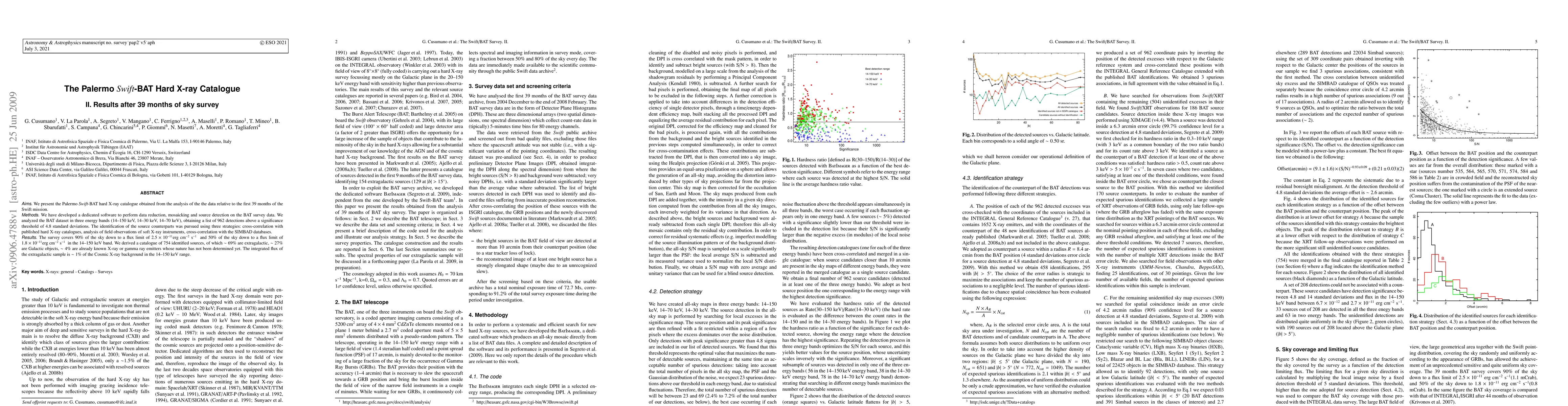 The Palermo Swift-BAT Hard X-ray Catalogue, compiled from 39 months of Swift mission data, lists 962 detections across three energy bands, identifying 754 sources. The survey covers 90% of the sky at a flux limit of 2.5x10E-11 erg/cm²/s, with 69% of identified sources being extragalactic.