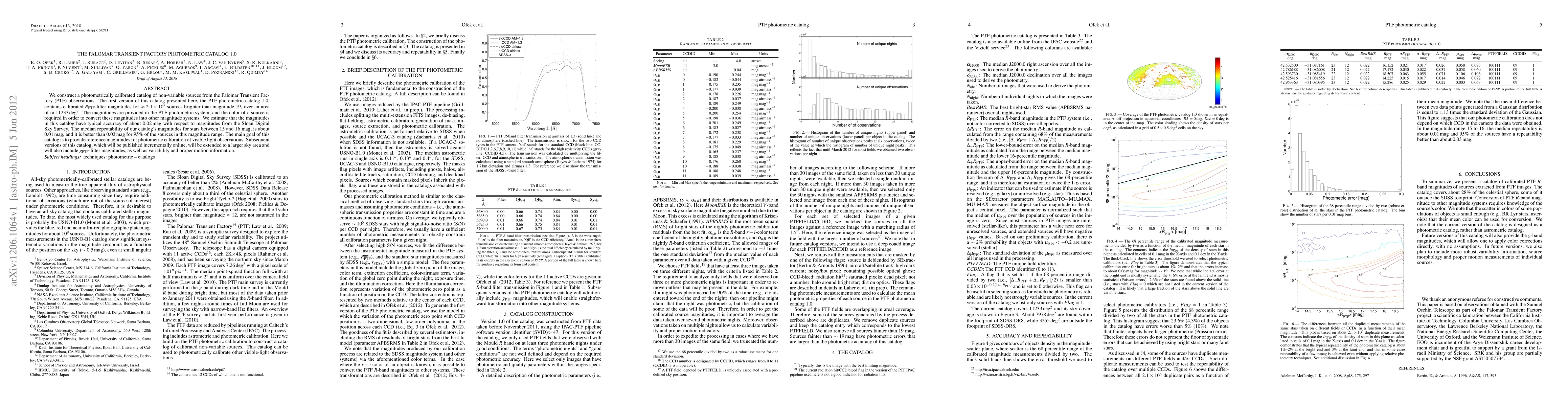 We construct a photometrically calibrated catalog of non-variable sources from the Palomar Transient Factory (PTF) observations. The first version of this catalog presented here, the PTF photometric catalog 1.0, contains calibrated R_PTF-filter magnitudes for about 21 million sources brighter than magnitude 19, over an area of about 11233 deg^2. The magnitudes are provided in the PTF photometric system, and the color of a source is required in order to convert these magnitudes into other magnitude systems. We estimate that the magnitudes in this catalog have typical accuracy of about 0.02 mag with respect to magnitudes from the Sloan Digital Sky Survey. The median repeatability of our catalog's magnitudes for stars between 15 and 16 mag, is about 0.01 mag, and it is better than 0.03 mag for 95% of the sources in this magnitude range. The main goal of this catalog is to provide reference magnitudes for photometric calibration of visible light observations. Subsequent versions of this catalog, which will be published incrementally online, will be extended to a larger sky area and will also include g_PTF-filter magnitudes, as well as variability and proper motion information.