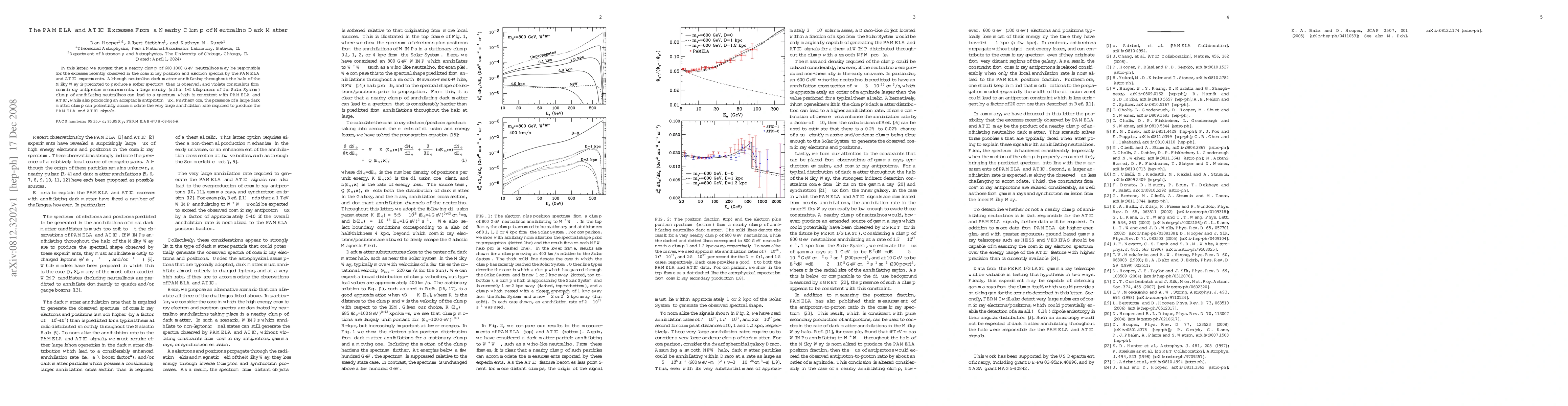 This paper proposes a nearby clump of 600-1000 GeV neutralinos as an explanation for the PAMELA and ATIC excesses in cosmic ray positron and electron spectra, suggesting that such a clump can produce a spectrum consistent with observations while maintaining acceptable antiproton flux.