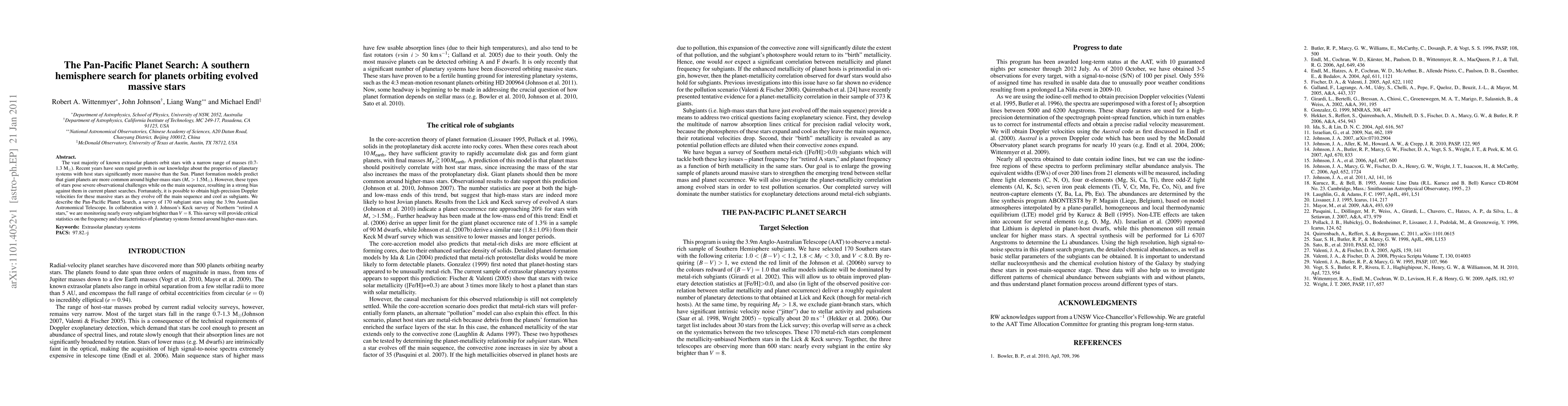 The Pan-Pacific Planet Search aims to detect planets orbiting evolved massive stars in the southern hemisphere, focusing on subgiants to overcome observational challenges. This survey, using the Australian Astronomical Telescope, seeks to provide insights into the prevalence of giant planets around stars more massive than the Sun.