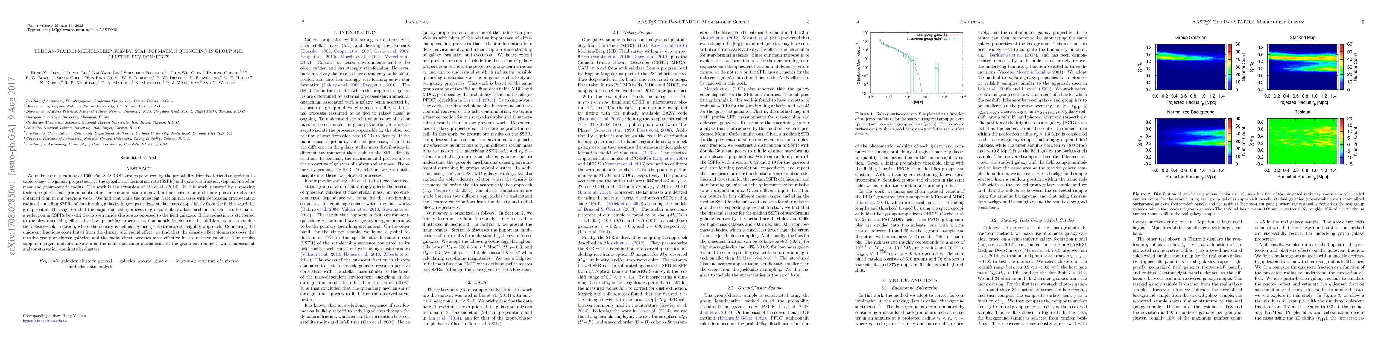We make use of a catalog of 1600 Pan-STARRS1 groups produced by the probability friends-of-friends algorithm to explore how the galaxy properties, i.e. the specific star formation rate (SSFR) and quiescent fraction, depend on stellar mass and group-centric radius. The work is the extension of Lin et al. (2014). In this work, powered by a stacking technique plus a background subtraction for contamination removal, a finer correction and more precise results are obtained than in our previous work. We find that while the quiescent fraction increases with decreasing group-centric radius the median SSFRs of star-forming galaxies in groups at fixed stellar mass drop slightly from the field toward the group center. This suggests that the major quenching process in groups is likely a fast mechanism. On the other hand, a reduction in SSFRs by ~0.2 dex is seen inside clusters as opposed to the field galaxies. If the reduction is attributed to the slow quenching effect, the slow quenching process acts dominantly in clusters. In addition, we also examine the density-color relation, where the density is defined by using a sixth-nearest neighbor approach. Comparing the quiescent fractions contributed from the density and radial effect, we find that the density effect dominates over the massive group or cluster galaxies, and the radial effect becomes more effective in less massive galaxies. The results support mergers and/or starvation as the main quenching mechanisms in the group environment, while harassment and/or starvation dominate in clusters.