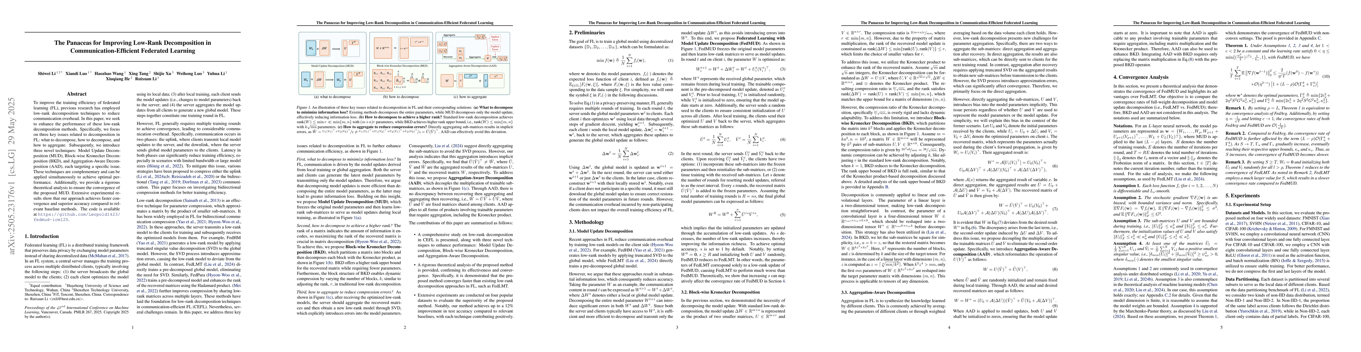 This paper introduces three novel techniques to improve low-rank decomposition in federated learning: Model Update Decomposition (MUD), Block-wise Kronecker Decomposition (BKD), and Aggregation-Aware Decomposition (AAD). These methods achieve faster convergence and superior accuracy compared to baseline methods.