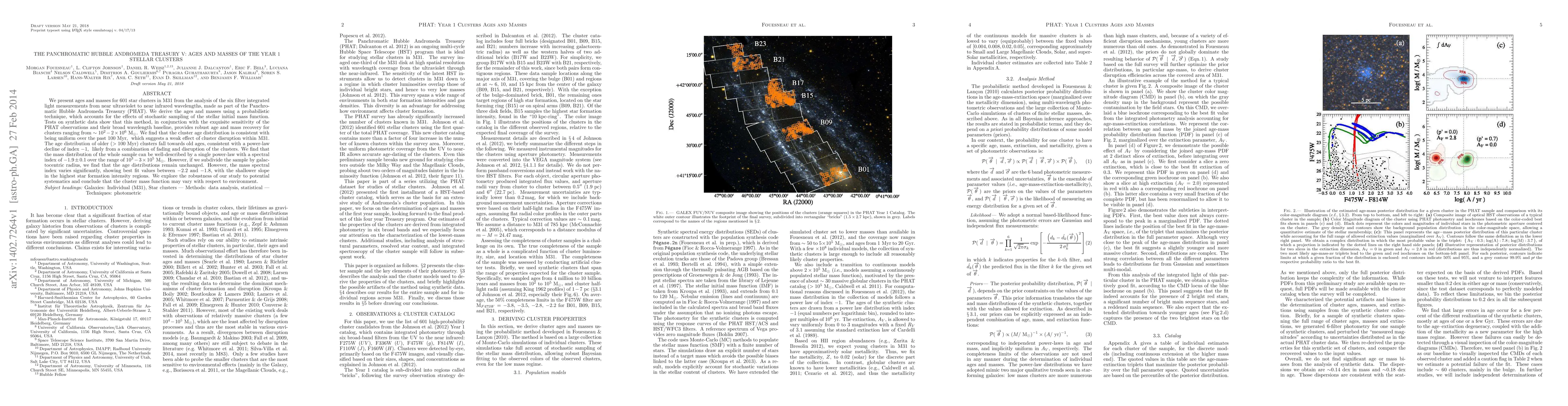 We present ages and masses for 601 star clusters in M31 from the analysis of the six filter integrated light measurements from near ultraviolet to near infrared wavelengths, made as part of the Panchromatic Hubble Andromeda Treasury (PHAT). We derive the ages and masses using a probabilistic technique, which accounts for the effects of stochastic sampling of the stellar initial mass function. Tests on synthetic data show that this method, in conjunction with the exquisite sensitivity of the PHAT observations and their broad wavelength baseline, provides robust age and mass recovery for clusters ranging from $\sim 10^2 - 2 \times 10^6 M_\odot$. We find that the cluster age distribution is consistent with being uniform over the past $100$ Myr, which suggests a weak effect of cluster disruption within M31. The age distribution of older ($>100$ Myr) clusters fall towards old ages, consistent with a power-law decline of index $-1$, likely from a combination of fading and disruption of the clusters. We find that the mass distribution of the whole sample can be well-described by a single power-law with a spectral index of $-1.9 \pm 0.1$ over the range of $10^3-3 \times 10^5 M_\odot$. However, if we subdivide the sample by galactocentric radius, we find that the age distributions remain unchanged. However, the mass spectral index varies significantly, showing best fit values between $-2.2$ and $-1.8$, with the shallower slope in the highest star formation intensity regions. We explore the robustness of our study to potential systematics and conclude that the cluster mass function may vary with respect to environment.