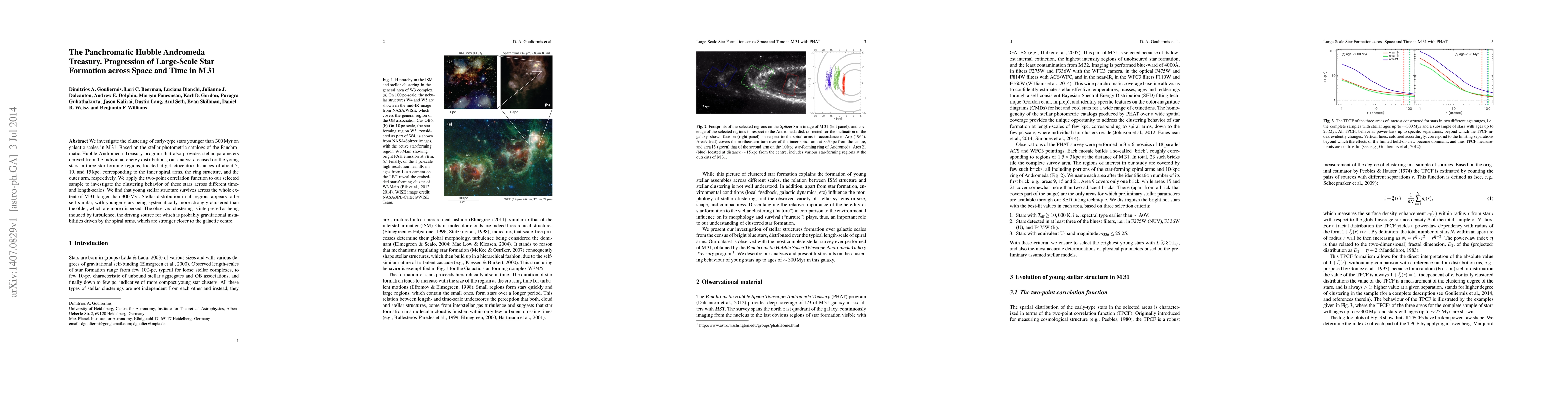 This study uses the Panchromatic Hubble Andromeda Treasury data to analyze the clustering of early-type stars younger than 300 Myr in three regions of M31, revealing that young stellar structures persist longer than 300 Myr and are more clustered than older stars. The observed clustering is attributed to turbulence driven by gravitational instabilities from the spiral arms.