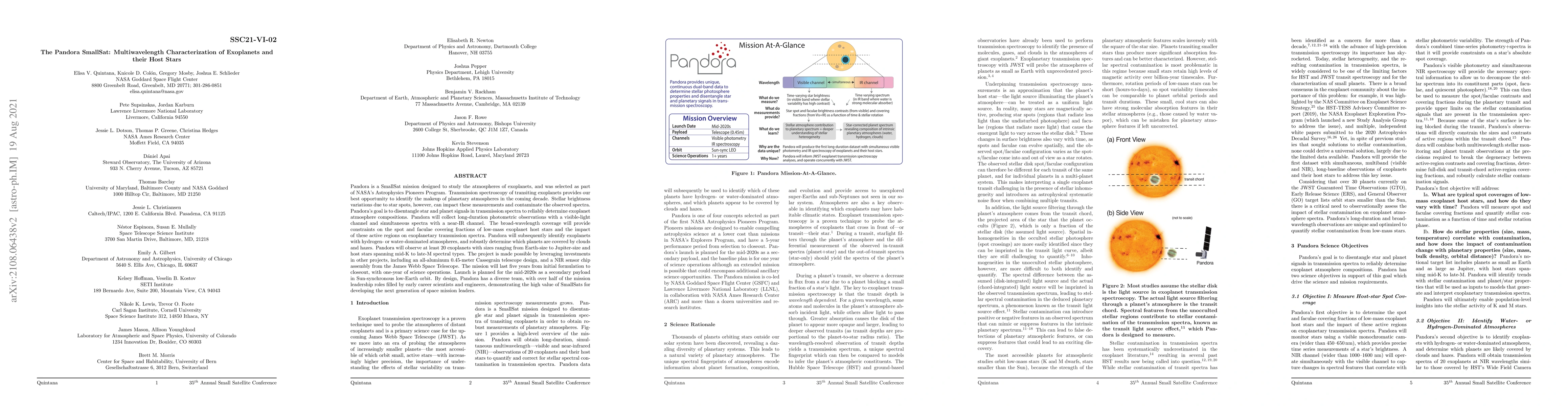 Pandora SmallSat aims to study exoplanet atmospheres using multiwavelength transmission spectroscopy, focusing on disentangling stellar and planetary signals to accurately determine atmospheric compositions. The mission will observe at least 20 exoplanets, leveraging existing telescope and sensor technology, and is planned for launch in the mid-2020s.