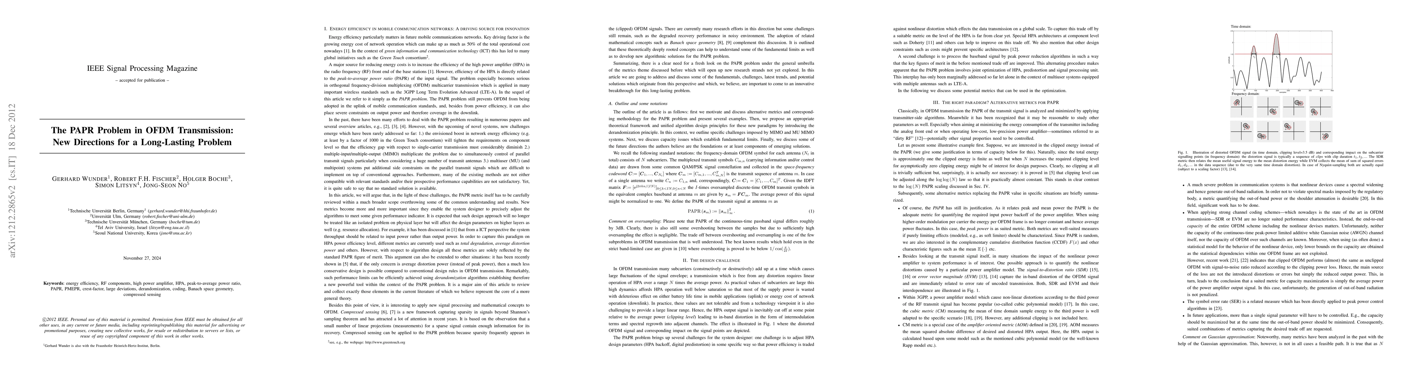 Peak power control for multicarrier communications has been a long-lasting problem in signal processing and communications. However, industry and academia are confronted with new challenges regarding energy efficient system design. Particularly, the envisioned boost in network energy efficiency (e.g. at least by a factor of 1000 in the Green Touch consortium) will tighten the requirements on component level so that the efficiency gap with respect to single-carrier transmission must considerably diminish. This paper reflects these challenges together with a unified framework and new directions in this field. The combination of large deviation theory, de-randomization and selected elements of Banach space geometry will offer a novel approach and will provide ideas and concepts for researchers with a background in industry as well as those from academia.
