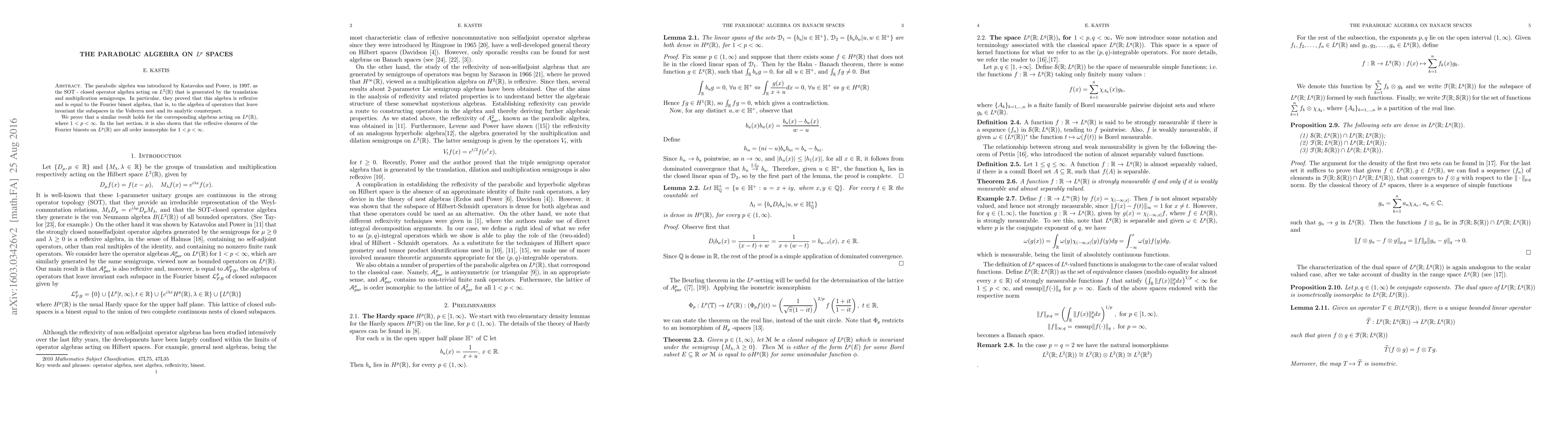 The parabolic algebra was introduced by Katavolos and Power, in 1997, as the operator algebra acting on $L^2(R)$ that is weakly generated by the translation and multiplication semigroups. In particular, they proved that this algebra is reflexive and is equal to the Fourier binest algebra, that is, to the algebra of operators that leave invariant the subspaces of the Volterra nest and its analytic counterpart. We prove that a similar result holds for the corresponding algebras acting on $L^p(R)$, where $1