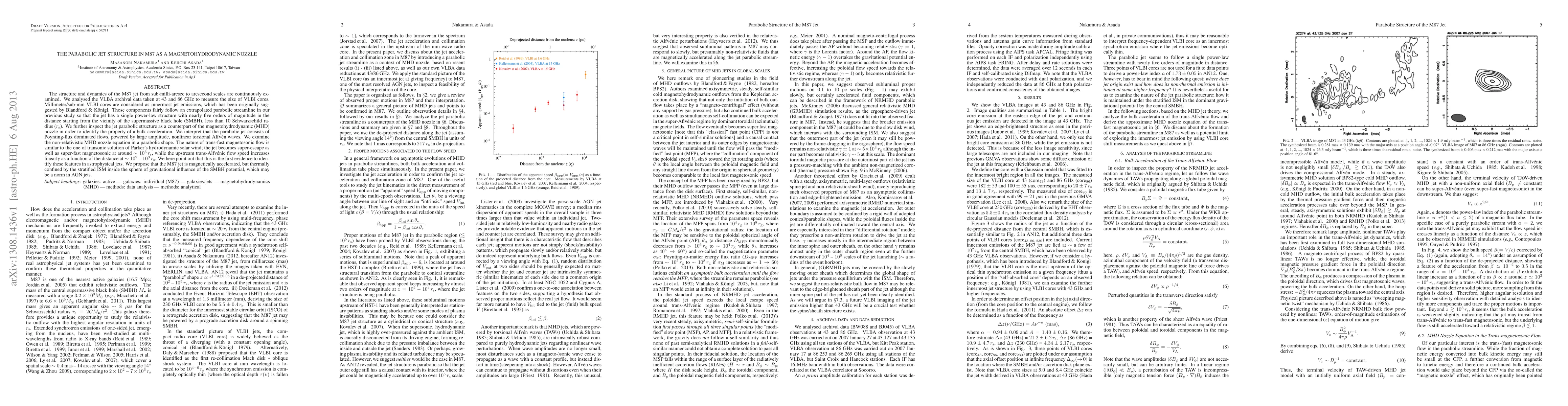 The structure and dynamics of the M87 jet from sub-milli-arcsec to arcsecond scales are continuously examined. We analysed the VLBA archival data taken at 43 and 86 GHz to measure the size of VLBI cores. Millimeter/sub-mm VLBI cores are considered as innermost jet emissions, which has been originally suggested by Blandford & K\"onigl. Those components fairly follow an extrapolated parabolic streamline in our previous study so that the jet has a single power-law structure with nearly five orders of magnitude in the distance starting from the vicinity of the supermassive black hole (SMBH), less than 10 Schwarzschild radius ($r_{\rm s}$). We further inspect the jet parabolic structure as a counterpart of the magnetohydrodynamic (MHD) nozzle in order to identify the property of a bulk acceleration. We interpret that the parabolic jet consists of Poynting-flux dominated flows, powered by large amplitude, nonlinear torsional Alfv\'en waves. We examine the non-relativistic MHD nozzle equation in a parabolic shape. The nature of trans-fast magnetosonic flow is similar to the one of transonic solution of Parker's hydrodynamic solar wind; the jet becomes super-escape as well as super-fast magnetosonic at around $\sim 10^{3}\,r_{\rm s}$, while the upstream trans-Alfv\'enic flow speed increases linearly as a function of the distance at $\sim 10^{2}$ - $10^{3}\, r_{\rm s}$. We here point out that this is the first evidence to identify these features in astrophysical jets. We propose that the M87 jet is magnetically accelerated, but thermally confined by the stratified ISM inside the sphere of gravitational influence of the SMBH potential, which may be a norm in AGN jets.