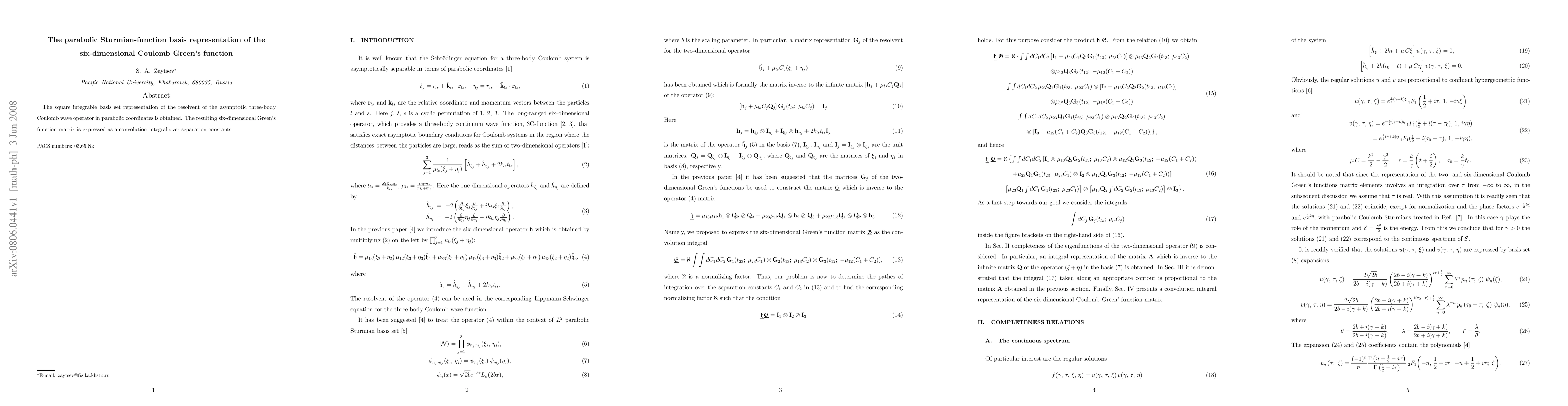 This paper presents a basis set representation for the six-dimensional Coulomb Green's function using parabolic Sturmian functions. The resulting six-dimensional Green's function is expressed as a convolution integral over separation constants.