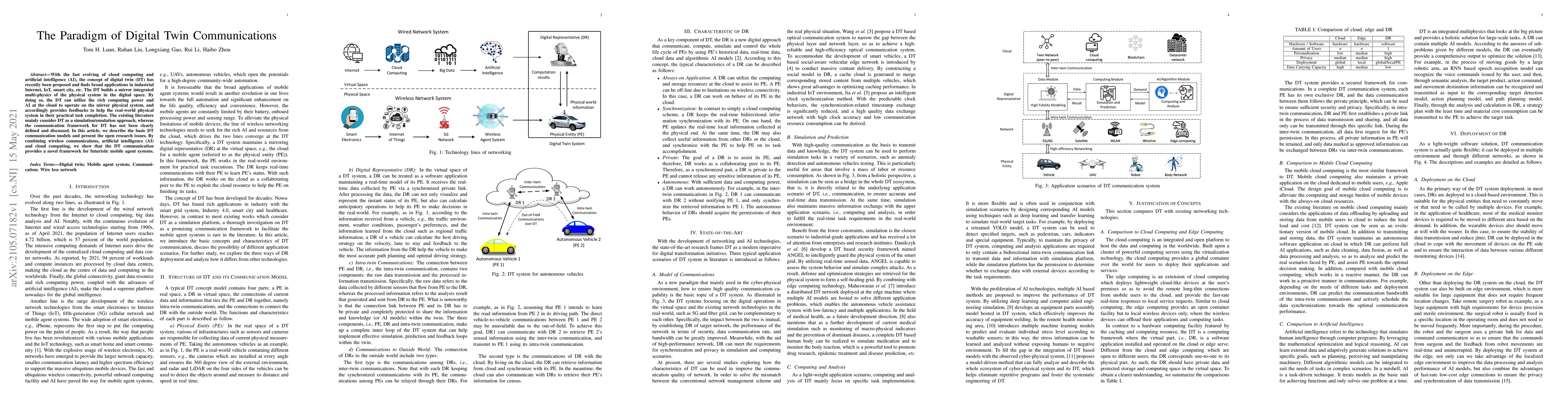 With the fast evolving of cloud computing and artificial intelligence (AI), the concept of digital twin (DT) has recently been proposed and finds broad applications in industrial Internet, IoT, smart city, etc. The DT builds a mirror integrated multi-physics of the physical system in the digital space. By doing so, the DT can utilize the rich computing power and AI at the cloud to operate on the mirror physical system, and accordingly provides feedbacks to help the real-world physical system in their practical task completion. The existing literature mainly considers DT as a simulation/emulation approach, whereas the communication framework for DT has not been clearly defined and discussed. In this article, we describe the basic DT communication models and present the open research issues. By combining wireless communications, artificial intelligence (AI) and cloud computing, we show that the DT communication provides a novel framework for futuristic mobile agent systems.