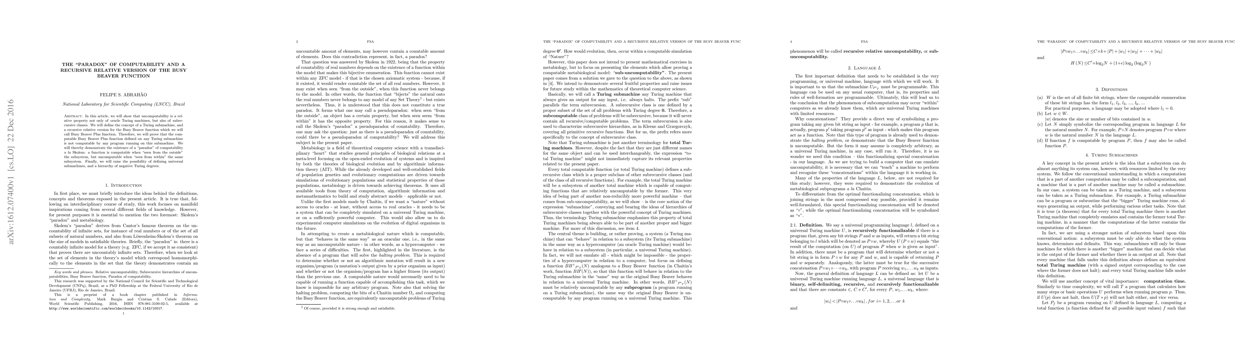 In this article, we will show that uncomputability is a relative property not only of oracle Turing machines, but also of subrecursive classes. We will define the concept of a Turing submachine, and a recursive relative version for the Busy Beaver function which we will call Busy Beaver Plus function. Therefore, we will prove that the computable Busy Beaver Plus function defined on any Turing submachine is not computable by any program running on this submachine. We will thereby demonstrate the existence of a "paradox" of computability a la Skolem: a function is computable when "seen from the outside" the subsystem, but uncomputable when "seen from within" the same subsystem. Finally, we will raise the possibility of defining universal submachines, and a hierarchy of negative Turing degrees.