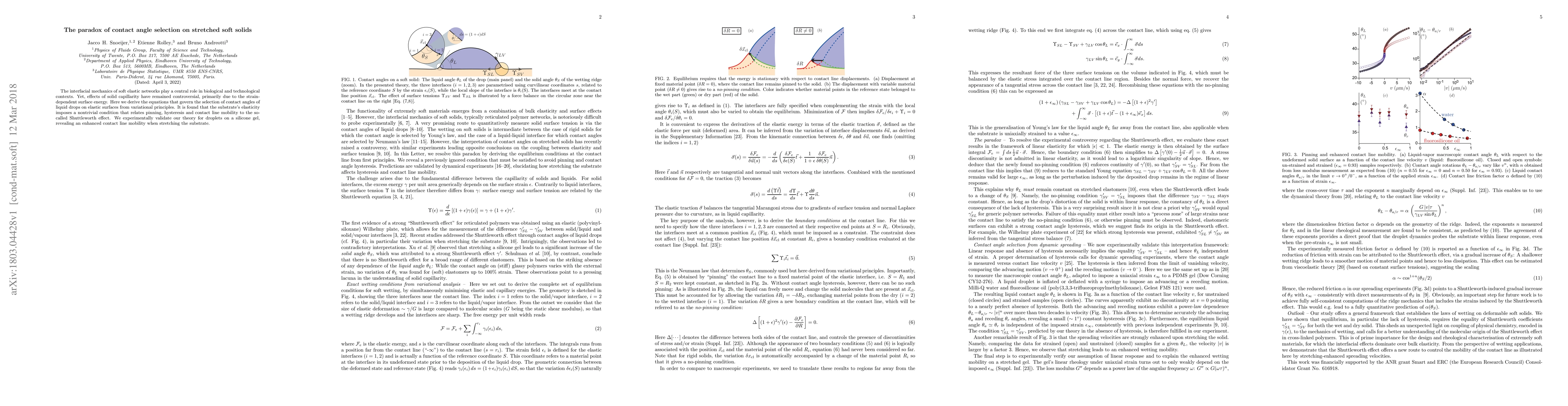 The interfacial mechanics of soft elastic networks play a central role in biological and technological contexts. Yet, effects of solid capillarity have remained controversial, primarily due to the strain-dependent surface energy. Here we derive the equations that govern the selection of contact angles of liquid drops on elastic surfaces from variational principles. It is found that the substrate's elasticity imposes a nontrivial condition that relates pinning, hysteresis and contact line mobility to the so-called Shuttleworth effect. We experimentally validate our theory for droplets on a silicone gel, revealing an enhanced contact line mobility when stretching the substrate.