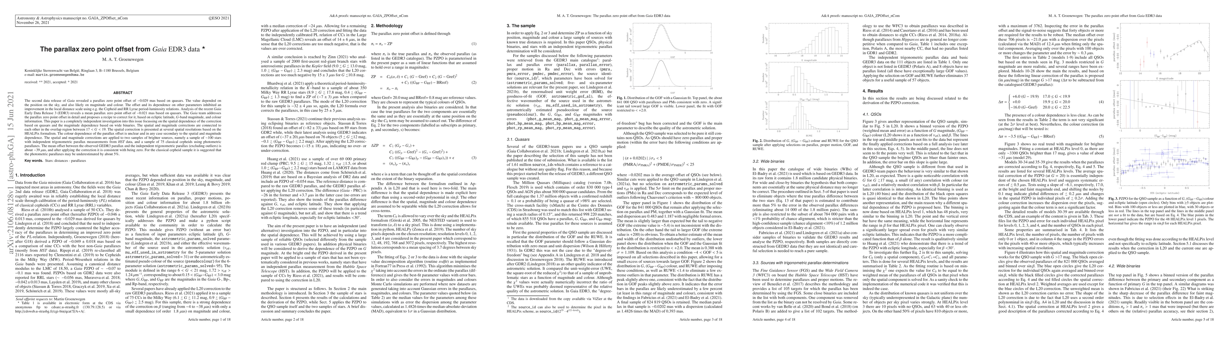 This paper investigates the parallax zero point offset in Gaia EDR3 data, revealing a mean offset of $-0.021$~mas based on quasars. It proposes spatial and magnitude-based corrections, showing that after applying these corrections, the parallax measurements align closely with independent trigonometric parallaxes.
