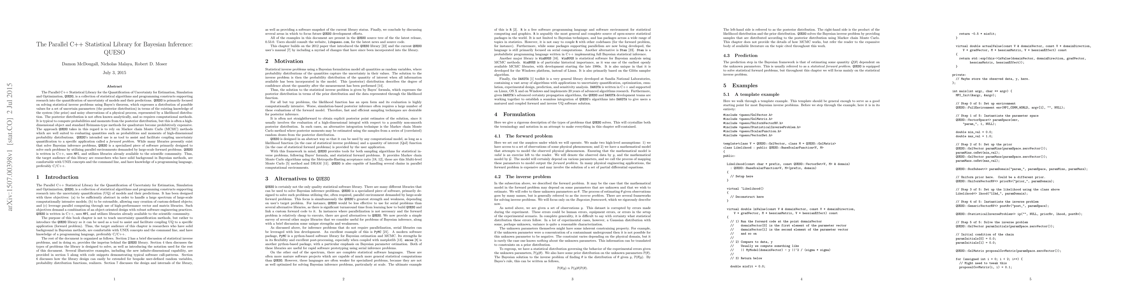 Queso is a Parallel C++ Statistical Library designed for Bayesian inference, employing Markov chain Monte Carlo methods to solve high-dimensional statistical inverse problems. It leverages parallel computing to efficiently compute probabilities and moments from the posterior distribution, aiding in uncertainty quantification for large-scale forward problems.