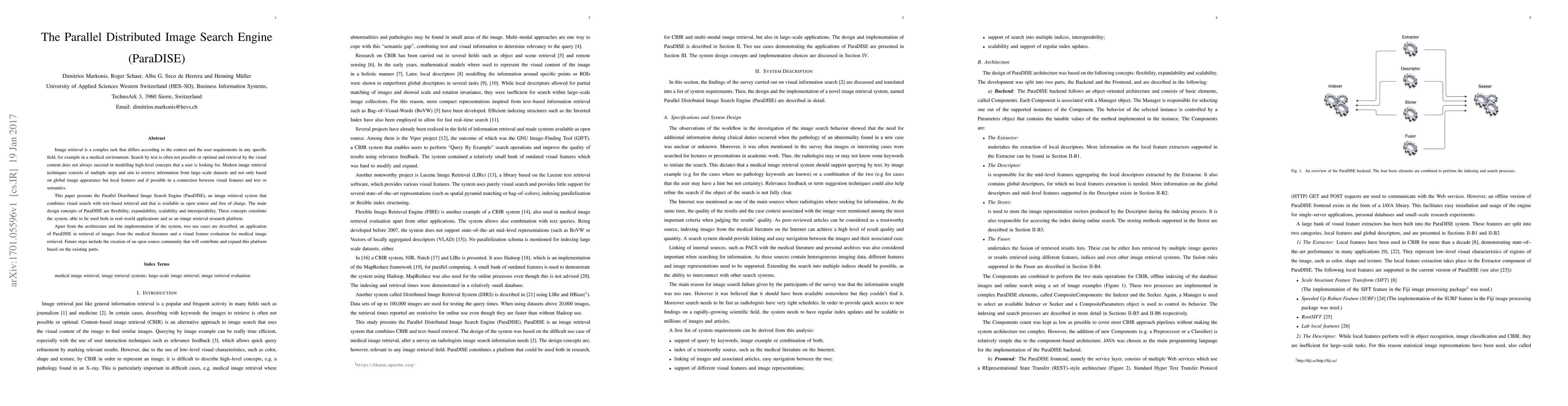 The ParaDISE image search engine integrates visual and text-based retrieval for flexible, scalable, and interoperable image search, particularly useful in medical contexts. It aims to enhance large-scale dataset retrieval beyond global appearance, with open-source availability and community-driven expansion.