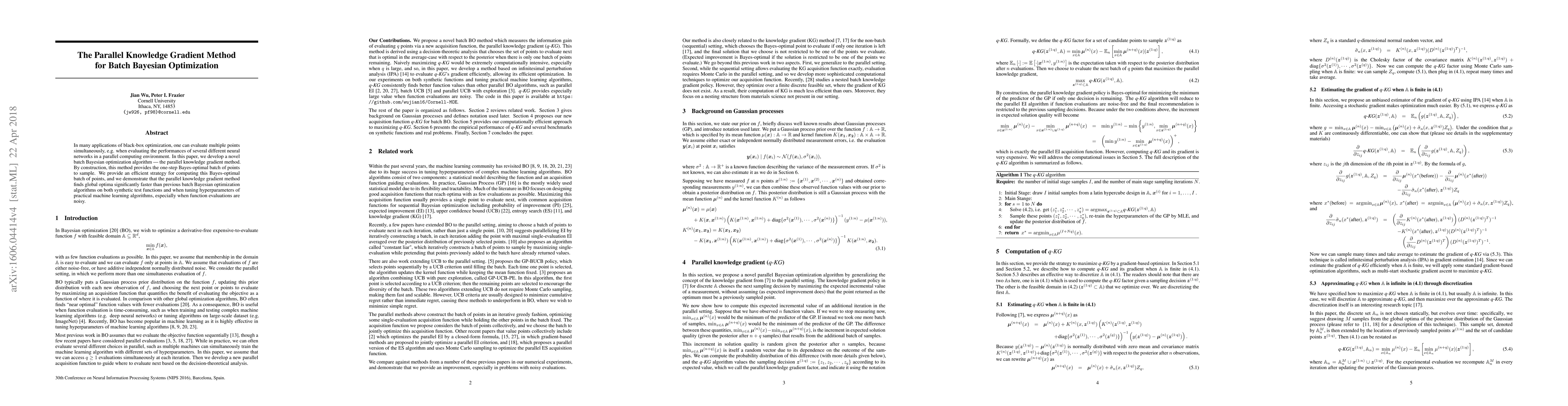The paper introduces the parallel knowledge gradient method for batch Bayesian optimization, which efficiently computes the Bayes-optimal batch of points to sample, significantly improving convergence speed over previous methods, especially in noisy environments.