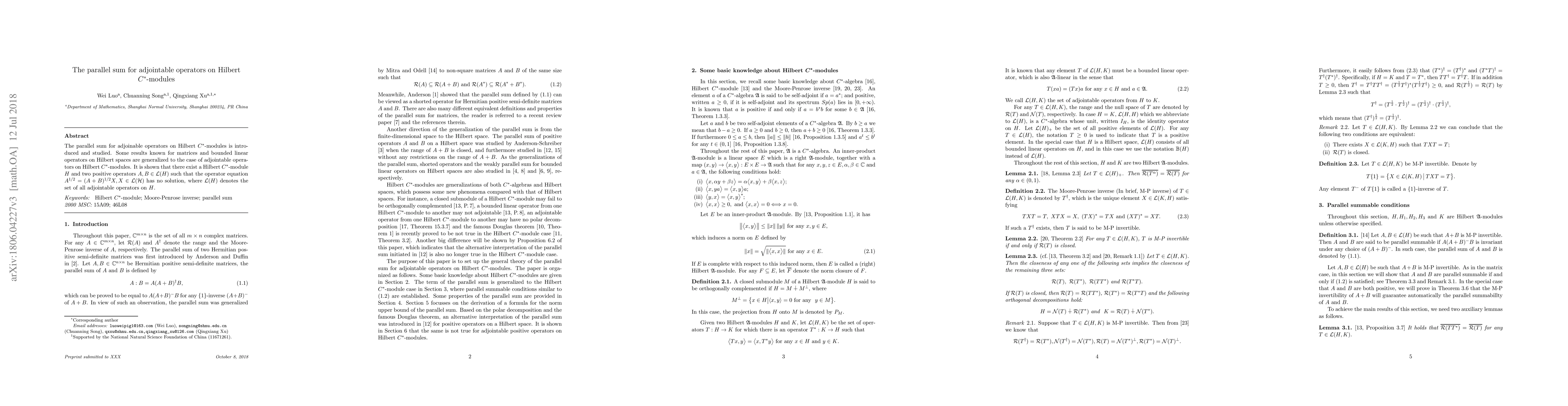 The paper introduces the concept of parallel sum for adjointable operators on Hilbert $C^*$-modules and generalizes results from matrices and bounded linear operators to this new framework. It demonstrates that for certain positive operators in $\mathcal{L}(H)$, the operator equation $A^{1/2}=(A+B)^{1/2}X$ has no solution.