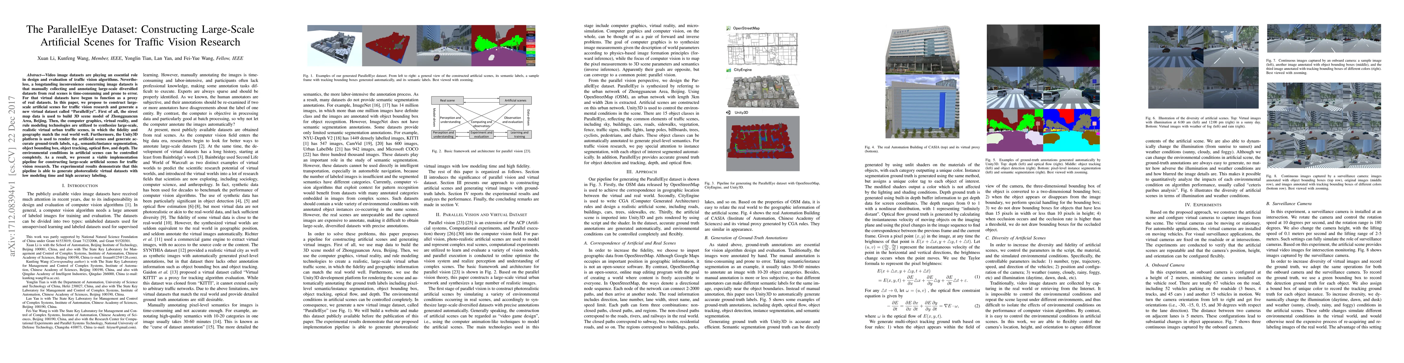This paper introduces the ParallelEye dataset, a large-scale artificial scene constructed for traffic vision research using 3D modeling and computer graphics. The dataset synthesizes realistic urban traffic scenes with accurate ground-truth labels, demonstrating a viable pipeline for generating photorealistic virtual datasets efficiently.