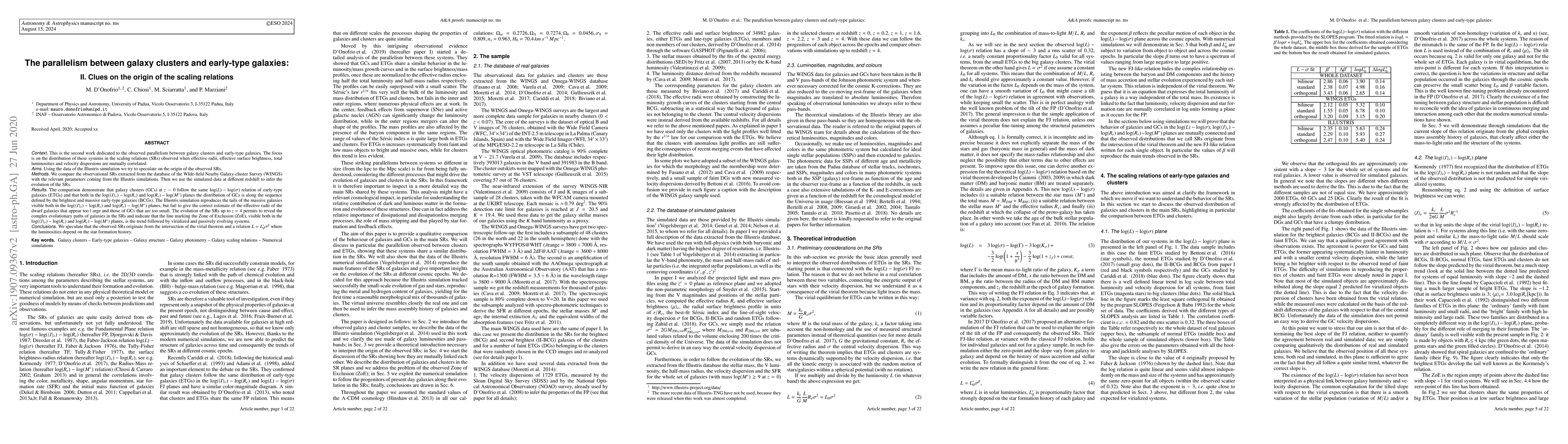 Context. This is the second work dedicated to the observed parallelism between galaxy clusters and early-type galaxies. The focus is on the distribution of these systems in the scaling relations (SRs) observed when effective radii, effective surface brightness, total luminosities and velocity dispersions are mutually correlated. Aims. Using the data of the Illustris simulation we try to speculate on the origin of the observed SRs. Methods. We compare the observational SRs extracted from the database of the WIde-field Nearby Galaxy-cluster Survey (WINGS) with the relevant parameters coming from the Illustris simulations. Then we use the simulated data at different redshift to infer the evolution of the SRs. Results. The comparison demonstrate that galaxy clusters (GCs) at z~0 follow the same log(L)-log(sigma) relation of early-type galaxies (ETGs) and that both in the log(Ie)-log(Re) and log(Re)-log(M*) planes the distribution of GCs is along the sequence defined by the brightest and massive early-type galaxies (BCGs). The Illustris simulation reproduces the tails of the massive galaxies visible both in the log(Ie)-log(Re) and log(Re)-log(M*) planes, but fail to give the correct estimate of the effective radii of the dwarf galaxies that appear too large and those of GCs that are too small. The evolution of the SRs up to z=4 permits to reveal the complex evolutionary paths of galaxies in the SRs and indicate that the line marking the Zone of Exclusion (ZoE), visible both in the log(Ie)-log(Re) and log(Re)-log(M*) planes, is the trend followed by virialized and passively evolving systems. Conclusions. We speculate that the observed SRs originate from the intersection of the virial theorem and a relation L=L_0 x sigma^beta where the luminosities depend on the star formation history.