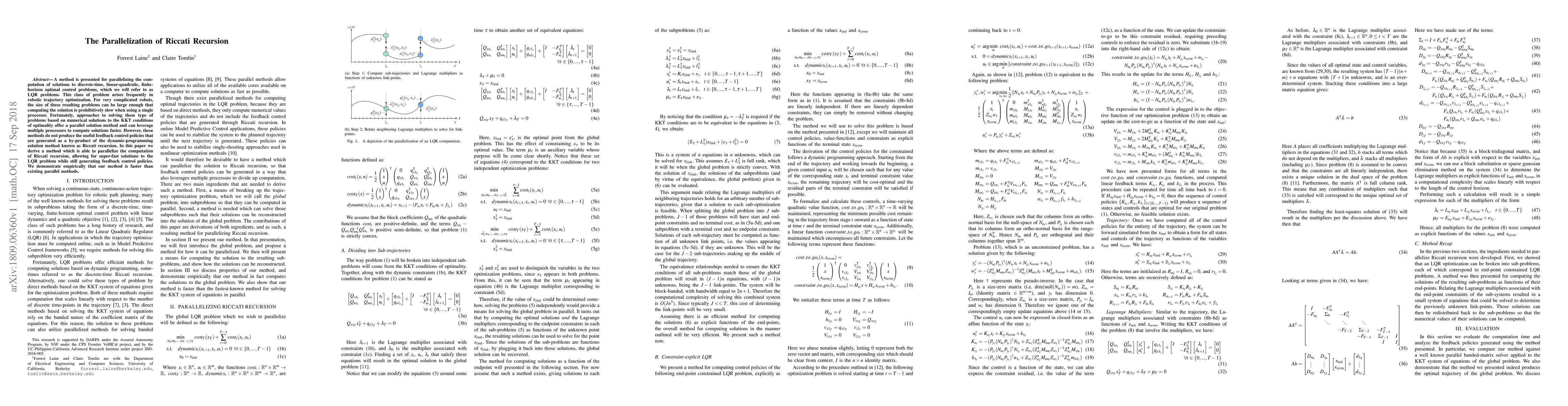 A method is presented for parallelizing the computation of solutions to discrete-time, linear-quadratic, finite-horizon optimal control problems, which we will refer to as LQR problems. This class of problem arises frequently in robotic trajectory optimization. For very complicated robots, the size of these resulting problems can be large enough that computing the solution is prohibitively slow when using a single processor. Fortunately, approaches to solving these type of problems based on numerical solutions to the KKT conditions of optimality offer a parallel solution method and can leverage multiple processors to compute solutions faster. However, these methods do not produce the useful feedback control policies that are generated as a by-product of the dynamic-programming solution method known as Riccati recursion. In this paper we derive a method which is able to parallelize the computation of Riccati recursion, allowing for super-fast solutions to the LQR problem while still generating feedback control policies. We demonstrate empirically that our method is faster than existing parallel methods.