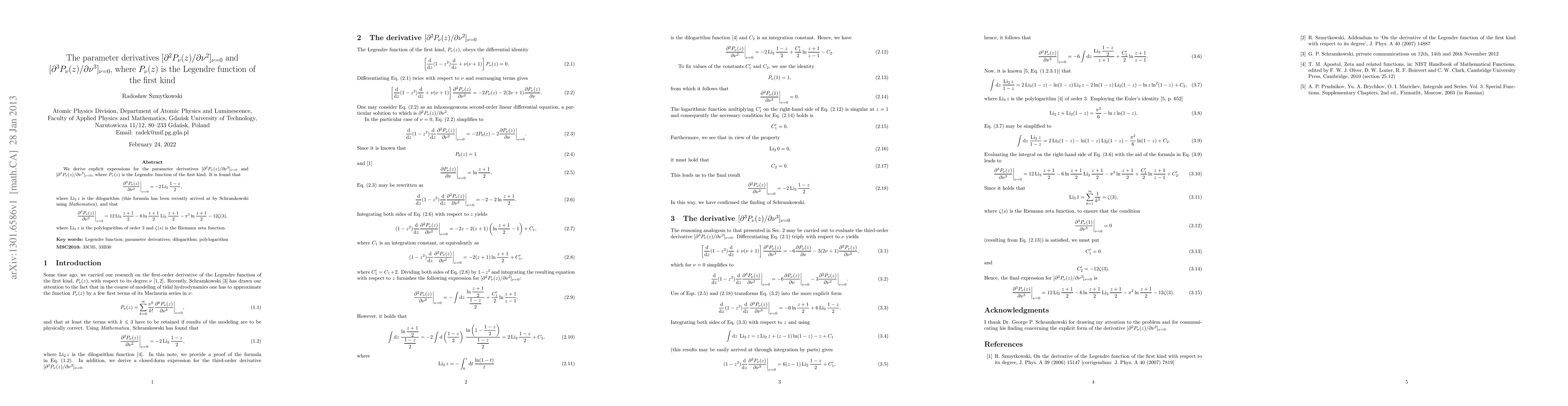 The paper derives explicit expressions for the second and third derivatives of the Legendre function of the first kind, $P_{\nu}(z)$, evaluated at $\nu=0$. The results include the second derivative as $-2\Li_{2}\frac{1-z}{2}$ and the third derivative as $12\Li_{3}\frac{z+1}{2}-6\ln\frac{z+1}{2}\Li_{2}\frac{z+1}{2}-\pi^{2}\ln\frac{z+1}{2}-12\zeta(3)$.