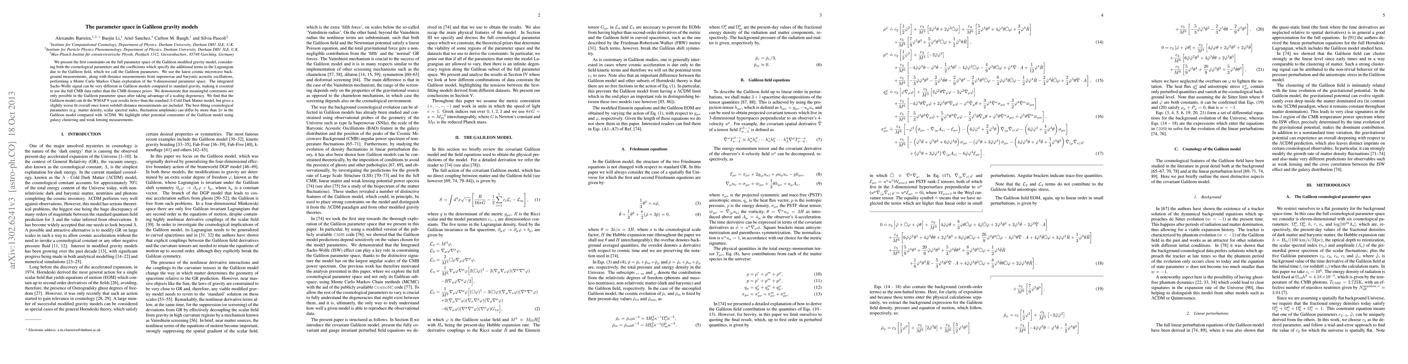 This paper provides the first constraints on the full parameter space of Galileon modified gravity models, using cosmic microwave background, supernovae, and baryonic acoustic oscillation data. It finds that the Galileon model can fit WMAP 9-year results better than the standard ΛCDM model but performs slightly worse with additional lower redshift data, highlighting the need for further constraints from galaxy clustering and weak lensing.