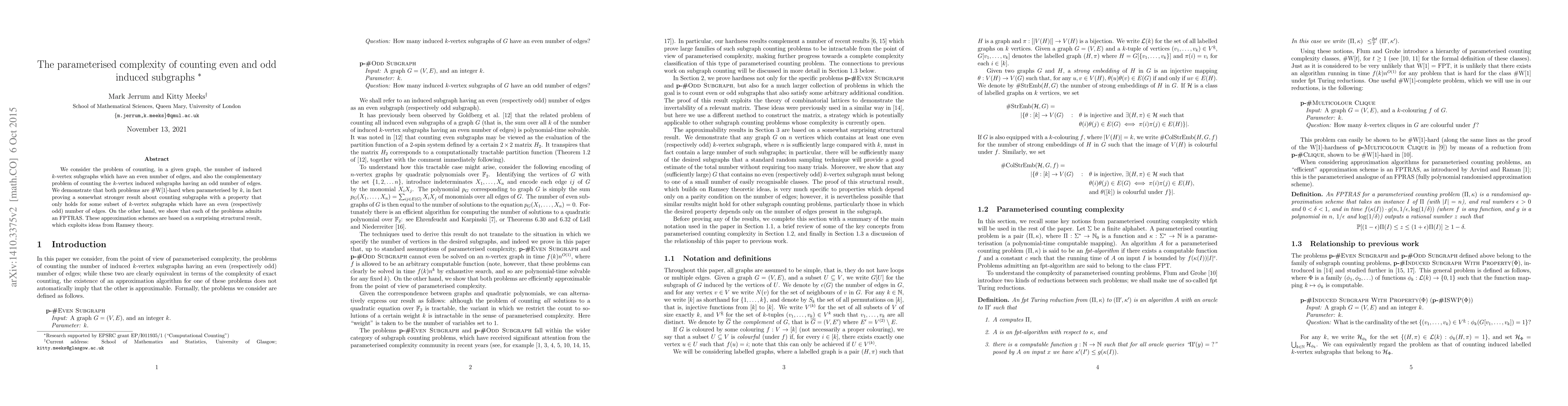 We consider the problem of counting, in a given graph, the number of induced k-vertex subgraphs which have an even number of edges, and also the complementary problem of counting the k-vertex induced subgraphs having an odd number of edges. We demonstrate that both problems are #W[1]-hard when parameterised by k, in fact proving a somewhat stronger result about counting subgraphs with a property that only holds for some subset of k-vertex subgraphs which have an even (respectively odd) number of edges. On the other hand, we show that the problems of counting even and odd k-vertex induced subgraphs both admit an FPTRAS. These approximation schemes are based on a surprising structural result, which exploits ideas from Ramsey theory.