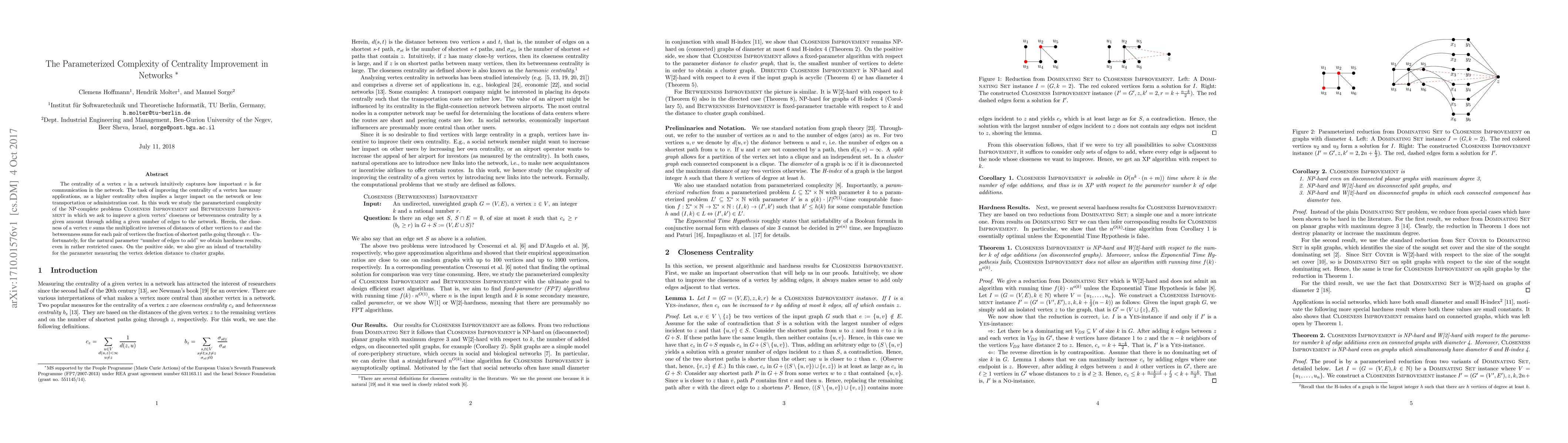 The centrality of a vertex v in a network intuitively captures how important v is for communication in the network. The task of improving the centrality of a vertex has many applications, as a higher centrality often implies a larger impact on the network or less transportation or administration cost. In this work we study the parameterized complexity of the NP-complete problems Closeness Improvement and Betweenness Improvement in which we ask to improve a given vertex' closeness or betweenness centrality by a given amount through adding a given number of edges to the network. Herein, the closeness of a vertex v sums the multiplicative inverses of distances of other vertices to v and the betweenness sums for each pair of vertices the fraction of shortest paths going through v. Unfortunately, for the natural parameter "number of edges to add" we obtain hardness results, even in rather restricted cases. On the positive side, we also give an island of tractability for the parameter measuring the vertex deletion distance to cluster graphs.
