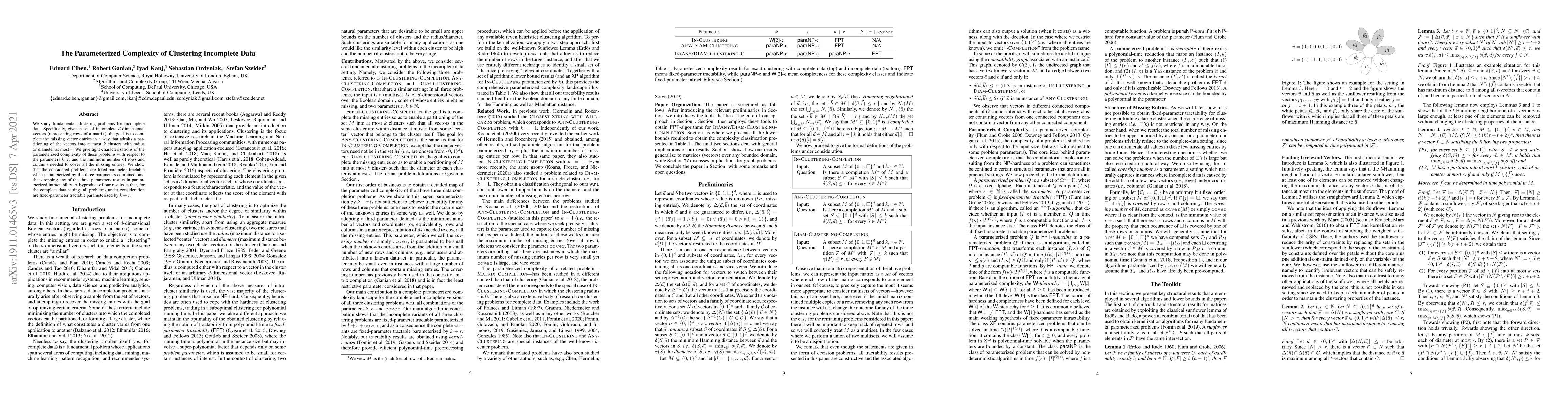 This paper investigates the parameterized complexity of clustering incomplete data, demonstrating that the problem is fixed-parameter tractable when parameterized by the cluster number, radius, and coverage of missing entries. It shows that dropping any single parameter leads to intractability.