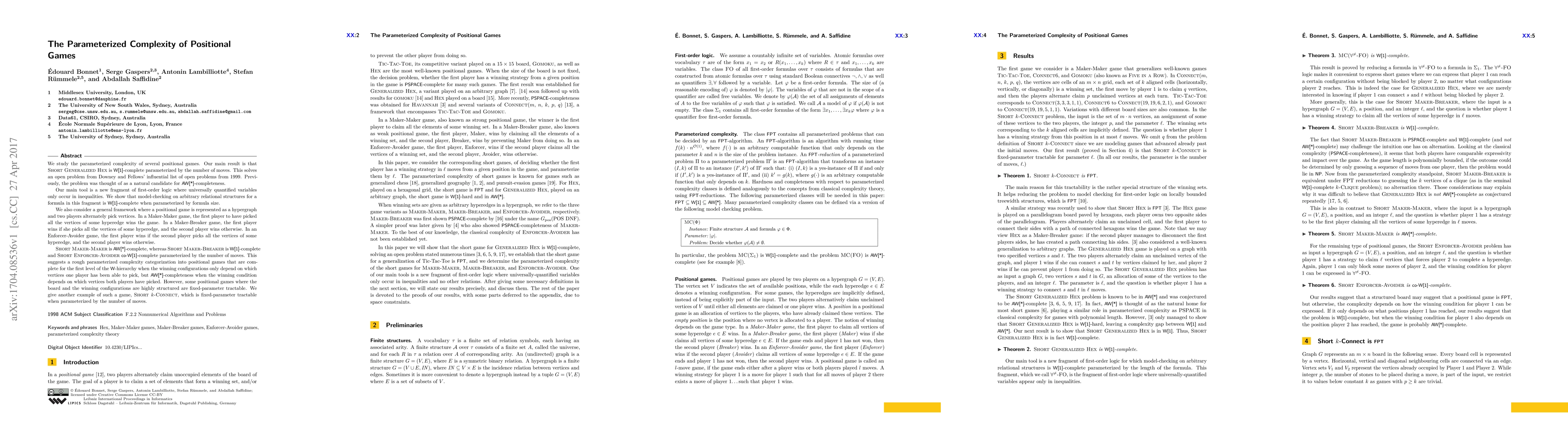 We study the parameterized complexity of several positional games. Our main result is that Short Generalized Hex is W[1]-complete parameterized by the number of moves. This solves an open problem from Downey and Fellows' influential list of open problems from 1999. Previously, the problem was thought of as a natural candidate for AW[*]-completeness. Our main tool is a new fragment of first-order logic where universally quantified variables only occur in inequalities. We show that model-checking on arbitrary relational structures for a formula in this fragment is W[1]-complete when parameterized by formula size. We also consider a general framework where a positional game is represented as a hypergraph and two players alternately pick vertices. In a Maker-Maker game, the first player to have picked all the vertices of some hyperedge wins the game. In a Maker-Breaker game, the first player wins if she picks all the vertices of some hyperedge, and the second player wins otherwise. In an Enforcer-Avoider game, the first player wins if the second player picks all the vertices of some hyperedge, and the second player wins otherwise. Short Maker-Maker is AW[*]-complete, whereas Short Maker-Breaker is W[1]-complete and Short Enforcer-Avoider co-W[1]-complete parameterized by the number of moves. This suggests a rough parameterized complexity categorization into positional games that are complete for the first level of the W-hierarchy when the winning configurations only depend on which vertices one player has been able to pick, but AW[*]-completeness when the winning condition depends on which vertices both players have picked. However, some positional games where the board and the winning configurations are highly structured are fixed-parameter tractable. We give another example of such a game, Short k-Connect, which is fixed-parameter tractable when parameterized by the number of moves.