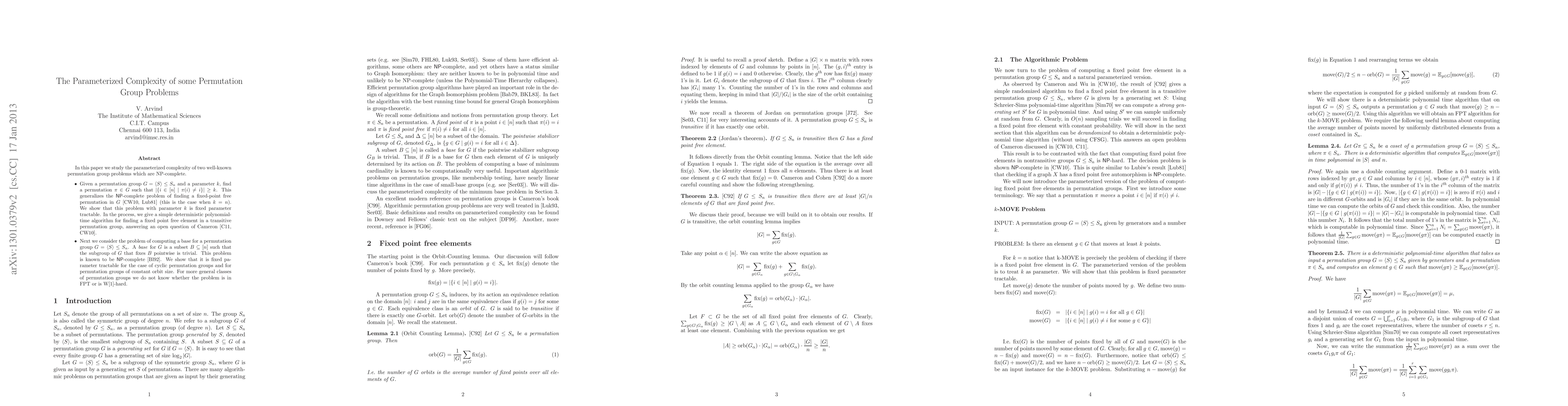 This paper examines the parameterized complexity of two NP-complete permutation group problems: finding a fixed-point free permutation with at least k moves and computing a base for a permutation group. The authors demonstrate that the first problem is fixed parameter tractable and provide a polynomial-time algorithm for transitive groups. They also show the base computation problem is fixed parameter tractable for cyclic groups and those with constant orbit size.