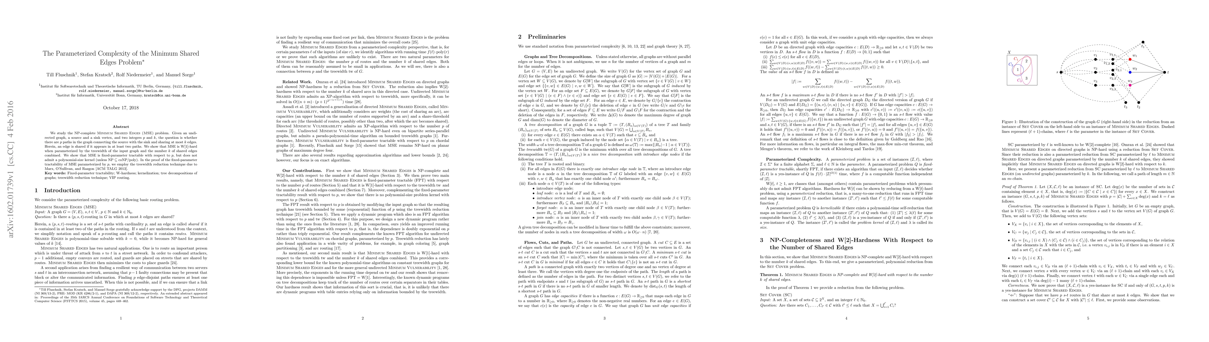 This research proves that the Minimum Shared Edges (MSE) problem, which involves finding p paths in a graph between a source and a sink with at most k shared edges, is W[1]-hard when parameterized by treewidth and k. However, it is fixed-parameter tractable with respect to p, and no polynomial-size kernel exists unless NP is in coNP/poly. The proof for p's tractability uses the treewidth reduction technique.