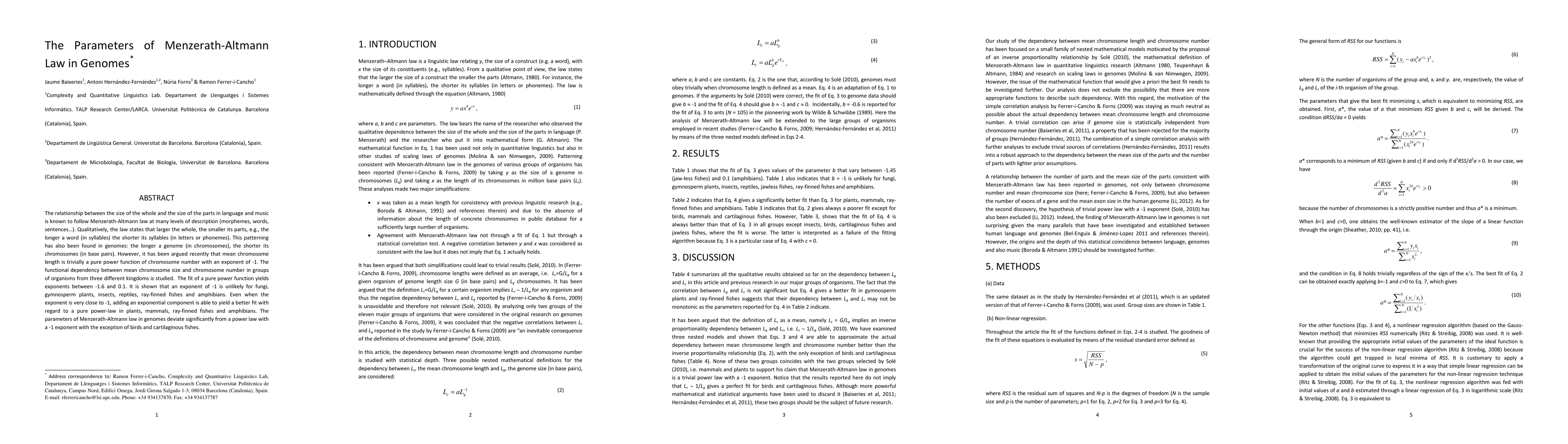 This paper investigates the Menzerath-Altmann law in genomes, finding that larger genomes tend to have shorter chromosomes. It concludes that the law's exponent deviates significantly from -1 in most organisms, suggesting a more complex relationship than previously thought.