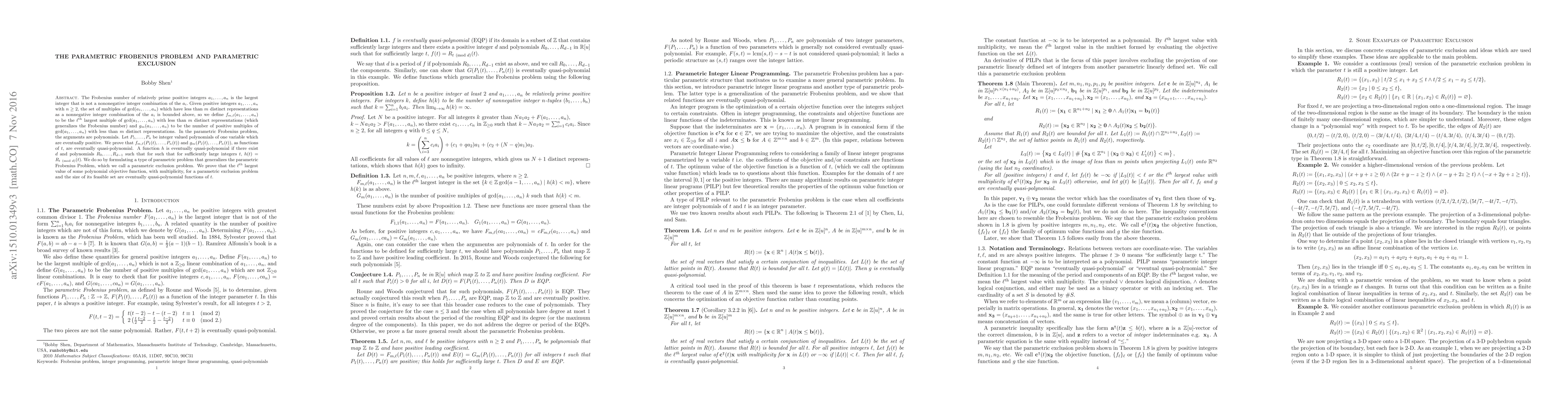 The paper investigates the parametric Frobenius problem, where the arguments are polynomials, and proves that certain functions related to this problem, such as the $m$-parametric Frobenius number and count, are eventually quasi-polynomial. This is achieved by introducing a parametric exclusion problem and demonstrating that its solutions are eventually quasi-polynomial.