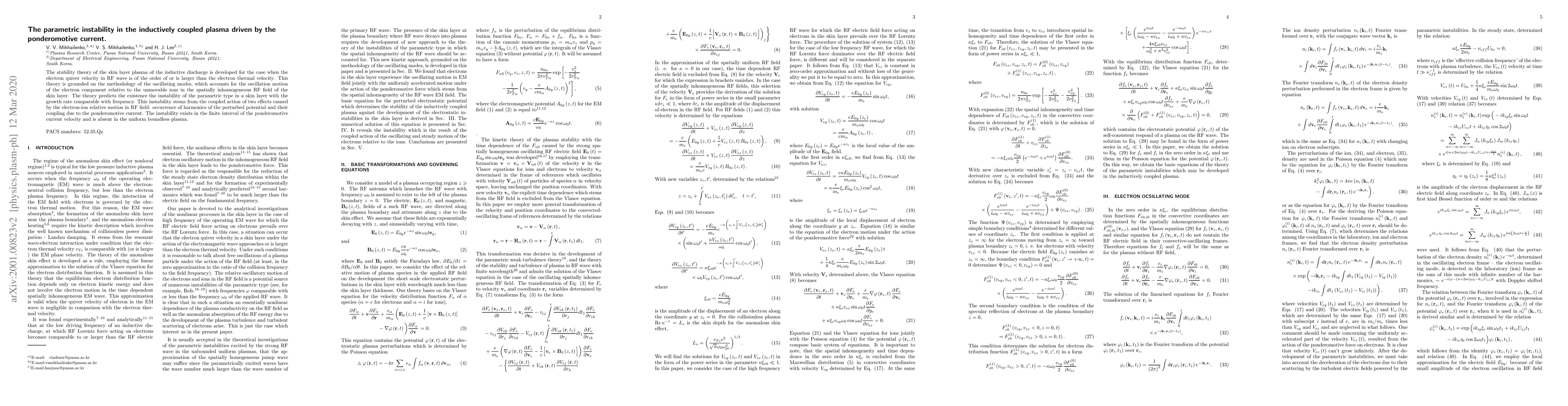This paper develops a stability theory for the skin layer plasma in inductive discharges where electron quiver velocity equals or exceeds thermal velocity. It predicts parametric instability in the skin layer due to the ponderomotive current, driven by the harmonics of perturbed potential and their coupling.