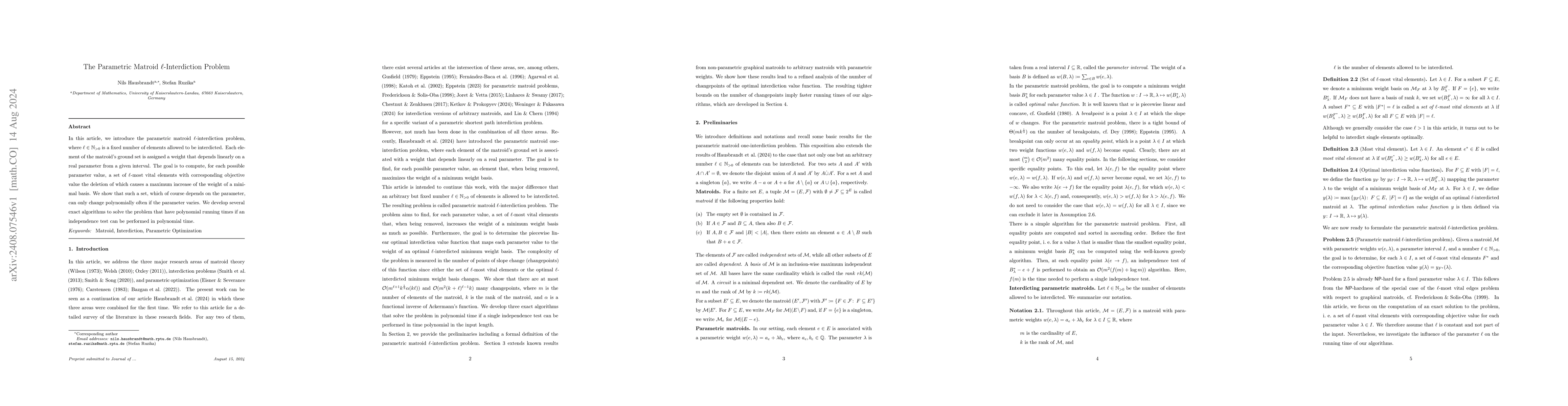 This paper introduces the parametric matroid $\ell$-interdiction problem, focusing on finding sets of $\ell$ most vital elements whose deletion maximizes the weight increase of a minimal basis. The authors demonstrate that the optimal set changes polynomially often with parameter variation and develop polynomial-time algorithms assuming polynomial independence tests.