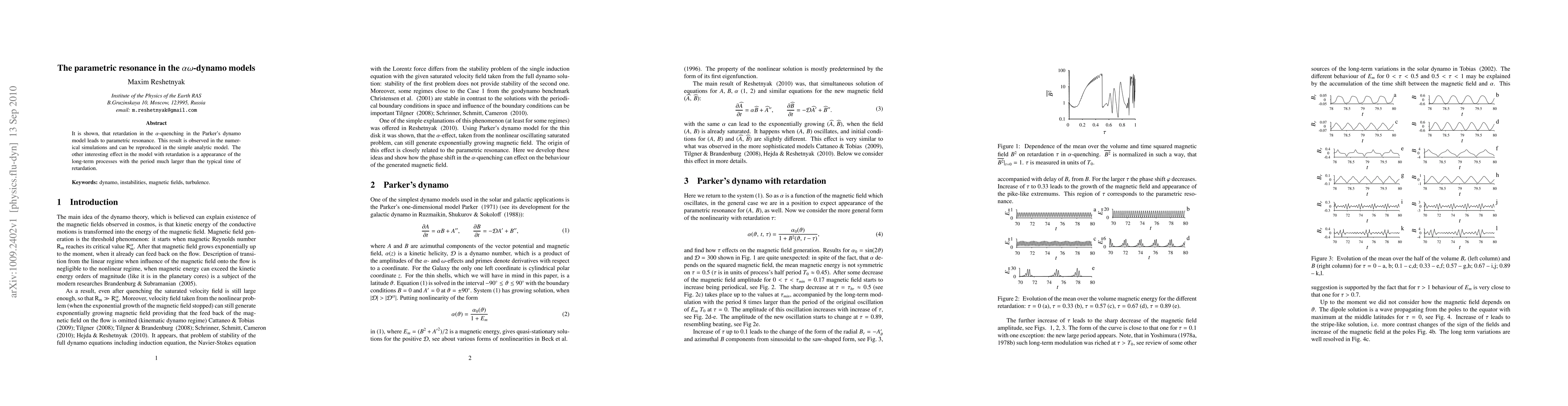 It is shown, that retardation in the $\alpha$-quenching in the Parker's dynamo model leads to parametric resonance. This result is observed in the numerical simulations and can be reproduced in the simple analytic model. The other interesting effect in the model with retardation is a appearance of the long-term processes with the period much larger than the typical time of retardation.