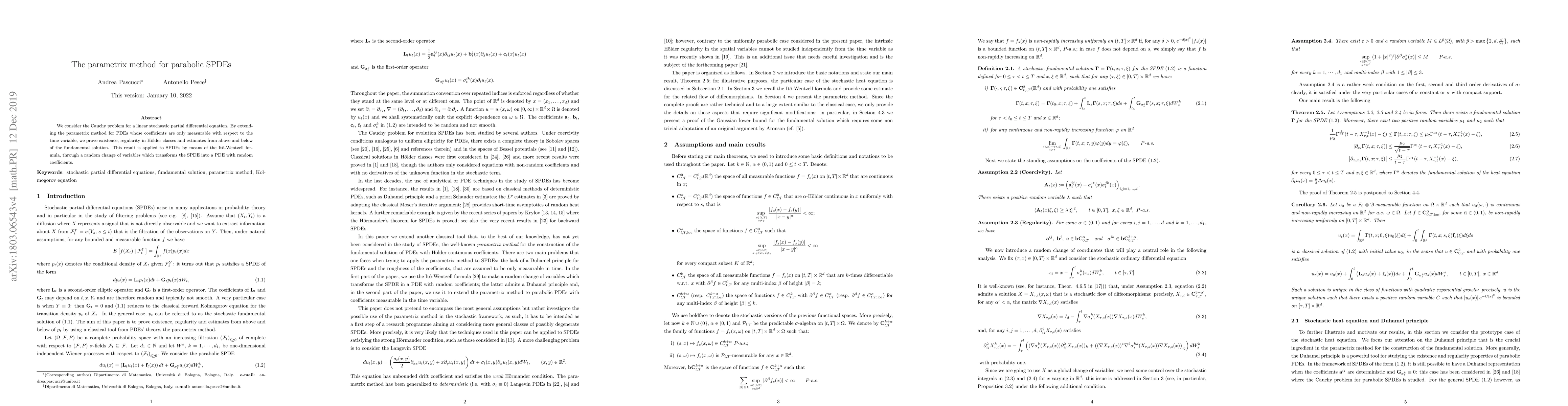 Researchers extend parametrix method for parabolic SPDEs to prove existence, regularity in H"older classes, and estimates of the fundamental solution.