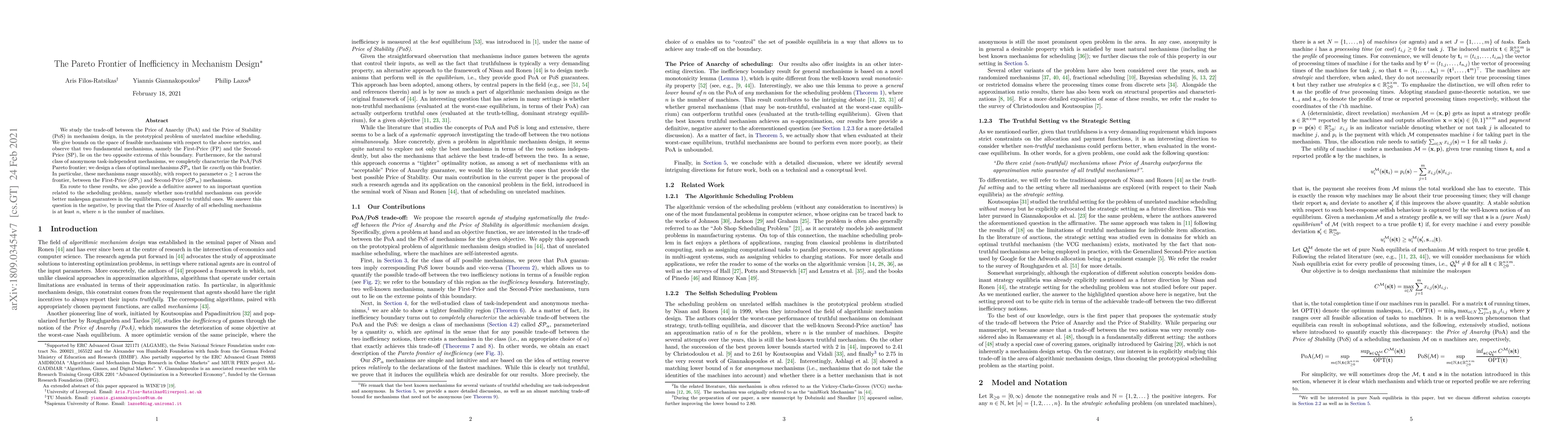 This paper investigates the trade-off between Price of Anarchy (PoA) and Price of Stability (PoS) in mechanism design, particularly in unrelated machine scheduling. It characterizes the optimal mechanisms $\mathcal{SP}_\alpha$ that lie on the Pareto frontier, smoothly transitioning between First-Price and Second-Price mechanisms, and proves that no non-truthful mechanism can outperform truthful ones in equilibrium scheduling.