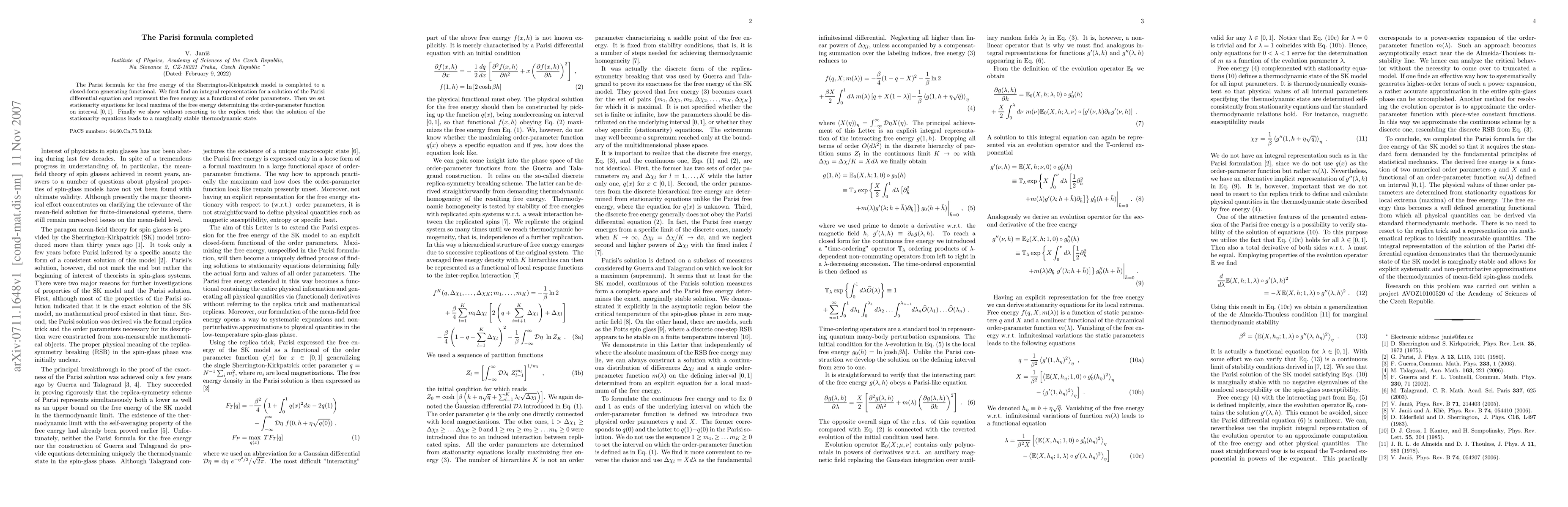 The paper completes the Parisi formula for the Sherrington-Kirkpatrick model by deriving a closed-form generating functional, solving the Parisi differential equation, and demonstrating a marginally stable thermodynamic state without using the replica trick.